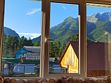 Пятиместный номер на 2 этаже, угловой, с панорамными окнами на горы, красивый вид на пик Любви. Туалет с раковиной на этаже, душ отдельно (в тёплом помещении с выходом на заднее крыльцо дома). Холодильник и микроволновка на этаже.