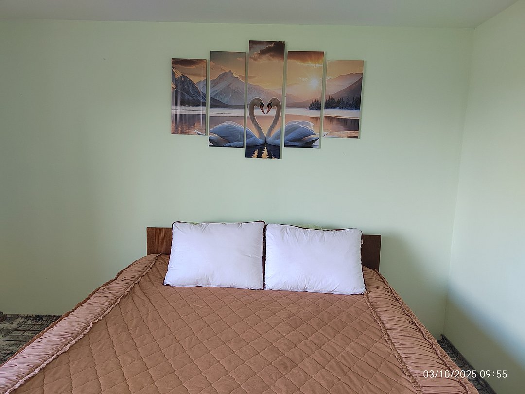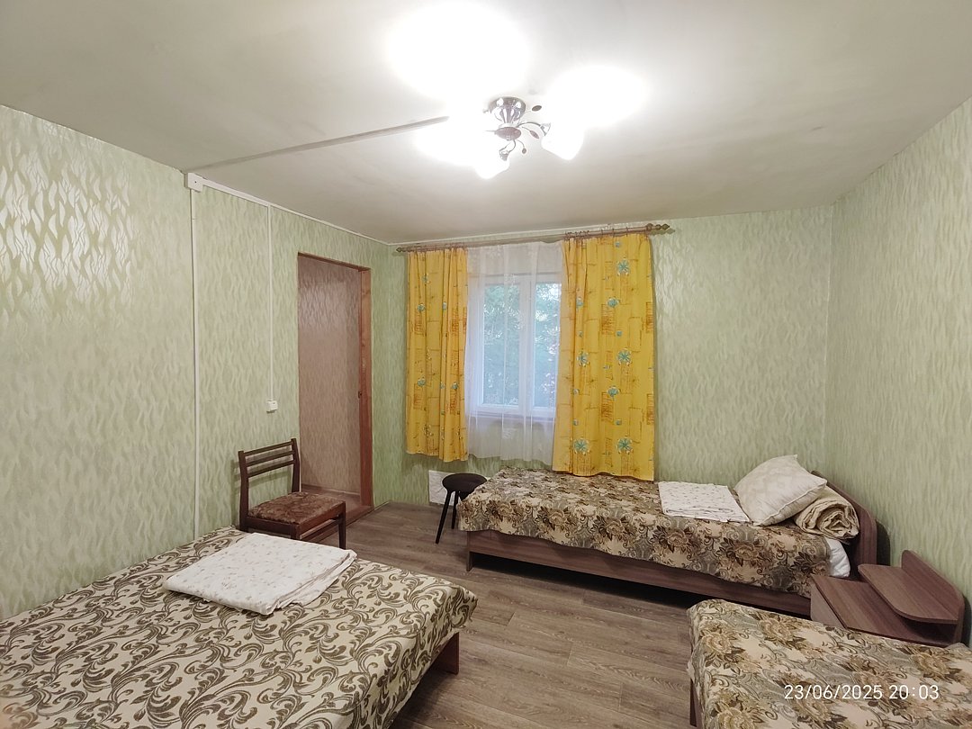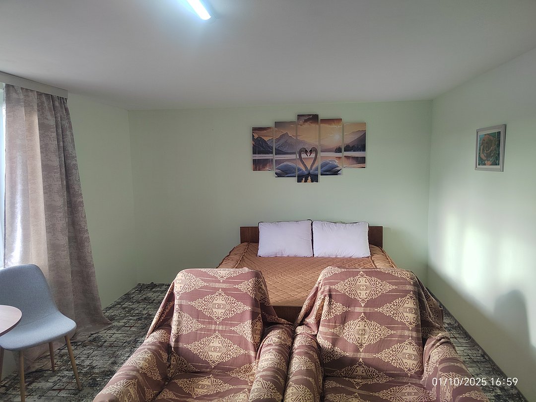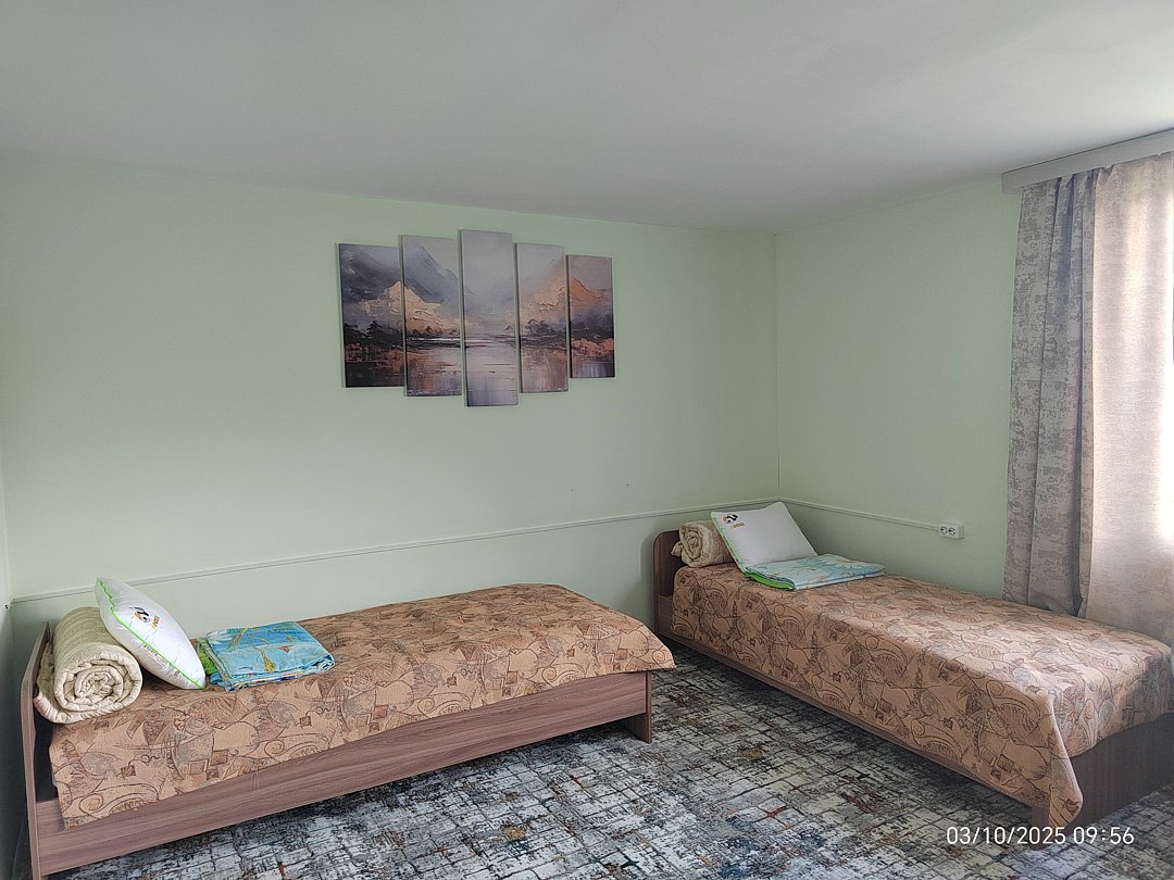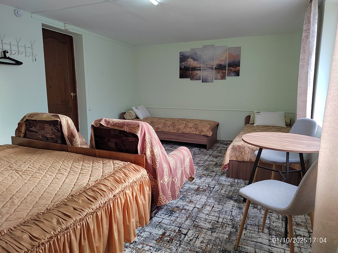 Четырёхместный угловой номер на 2 этаже с красивым видом на горы. Удобные новые матрасы, лёгкие и в меру тёплые новые натуральные одеяла, новые комфортные подушки.