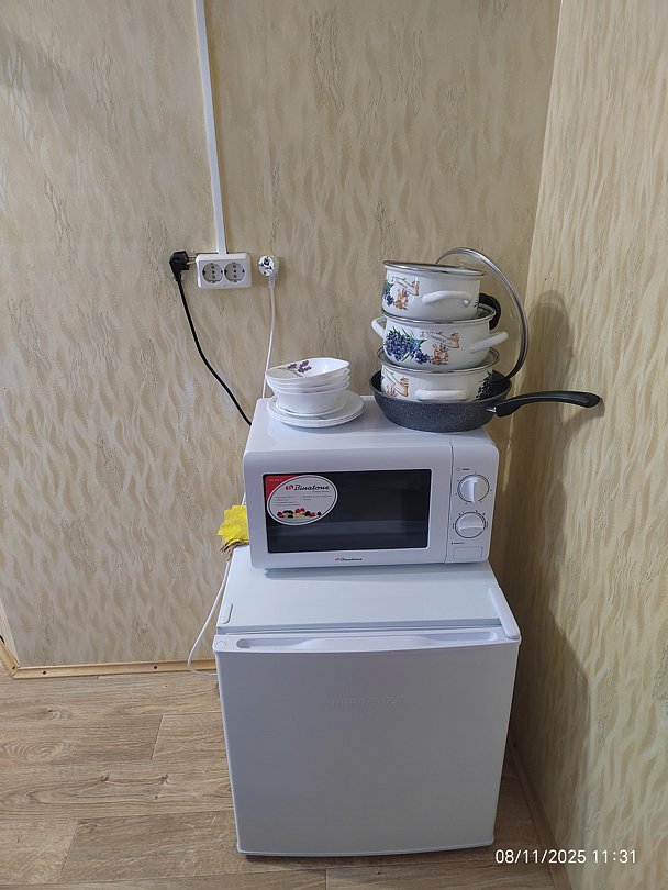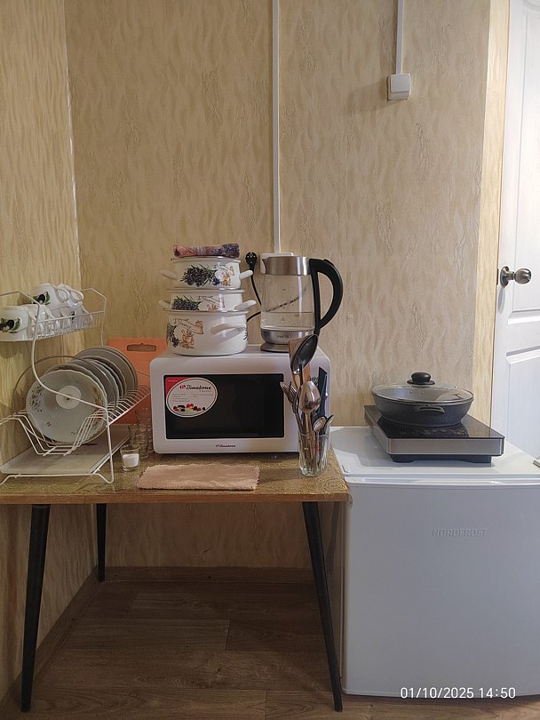 Холодильник и микроволновка на этаже. В номере чайник и посуда. Общая кухня со всем содержимым на 1 этаже. Также есть баня-сауна с душем и с купелью.