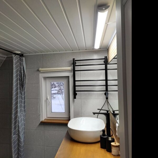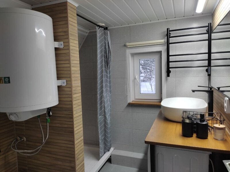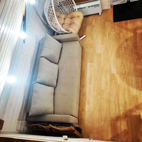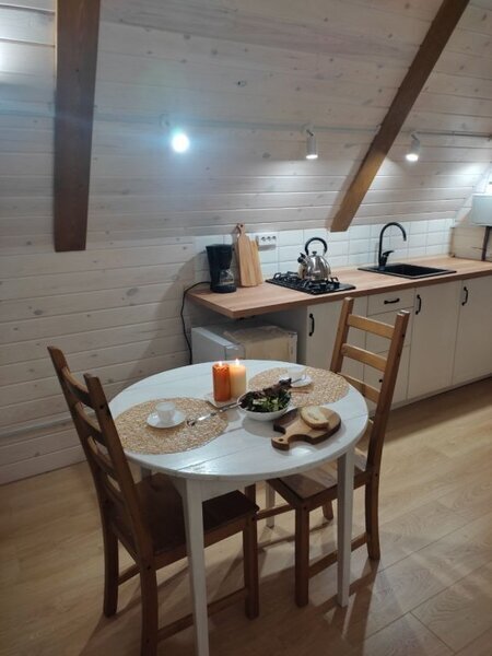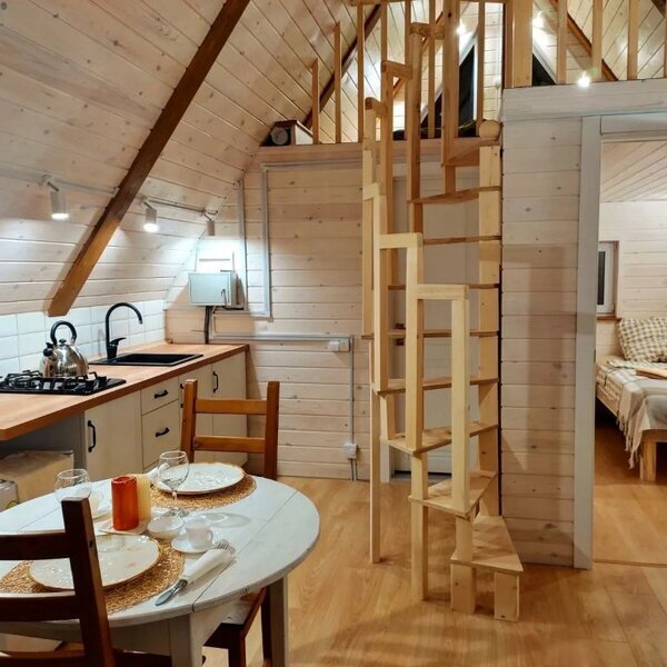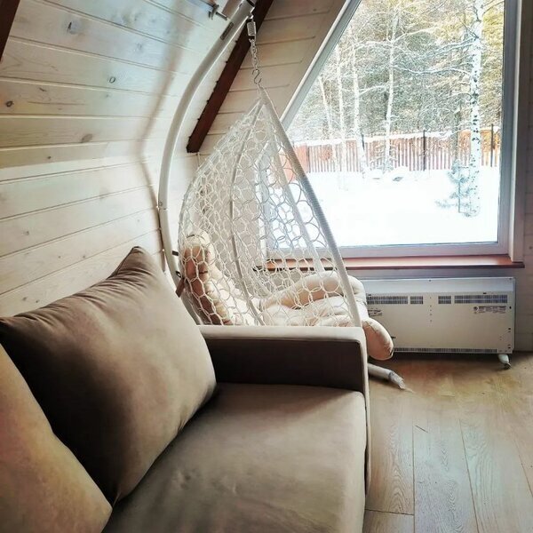 В домах просторная кухня-гостиная с большим столом, настоящим камином, диваном и качелей. Из окон открывается вид на лес.