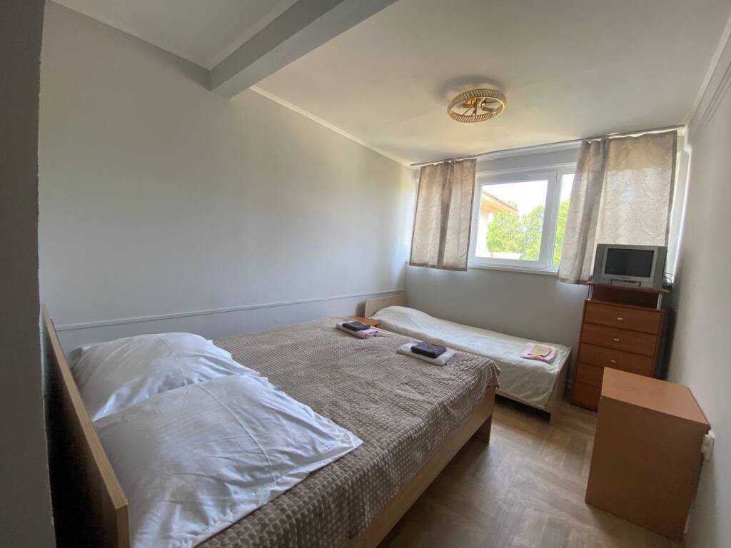 Трехместный комфортабельный номер с отдельным входом. В номере двуспальная и полутора спальная кровать, шкаф, телевизор, тумбочки, зеркало. Удобства в номере: душ, туалет, раковина.