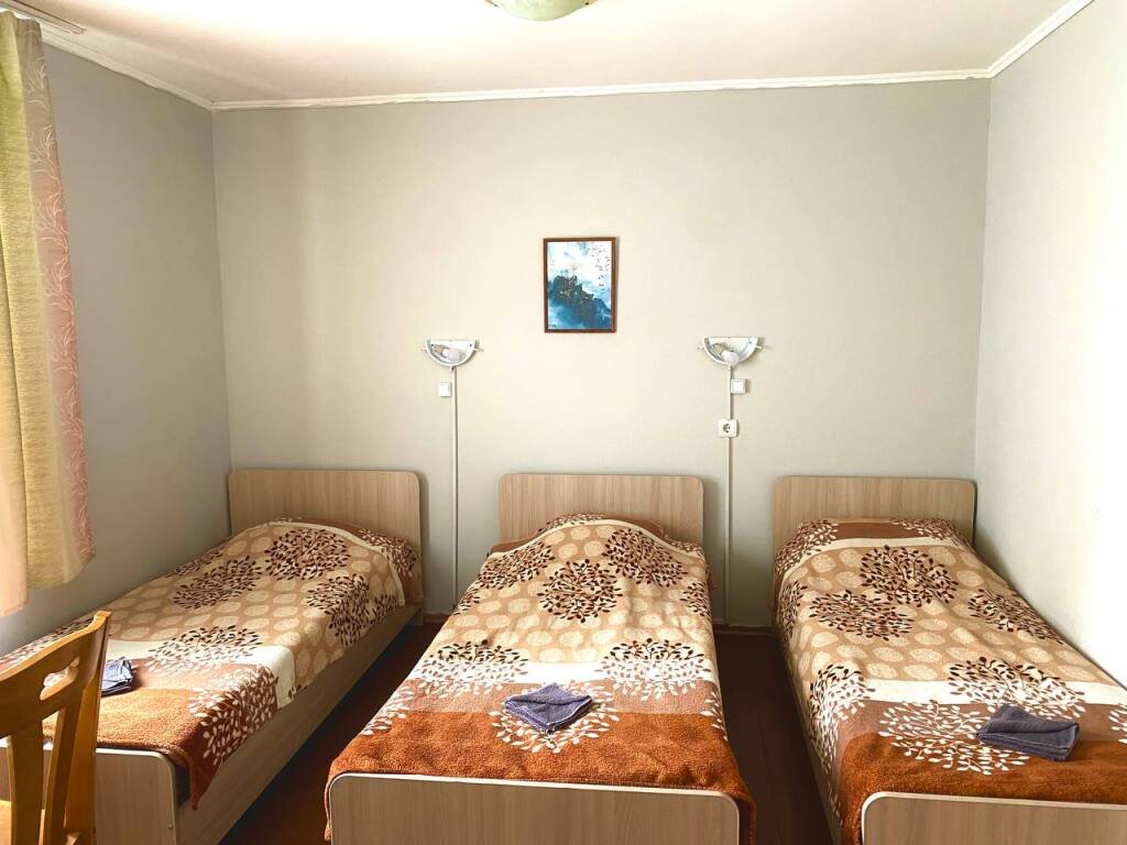 Трехместный номер находится в одноэтажном корпусе, номер оснащен полутора спальными кроватями, комодом, столом, стульями, удобства расположены на этаже.