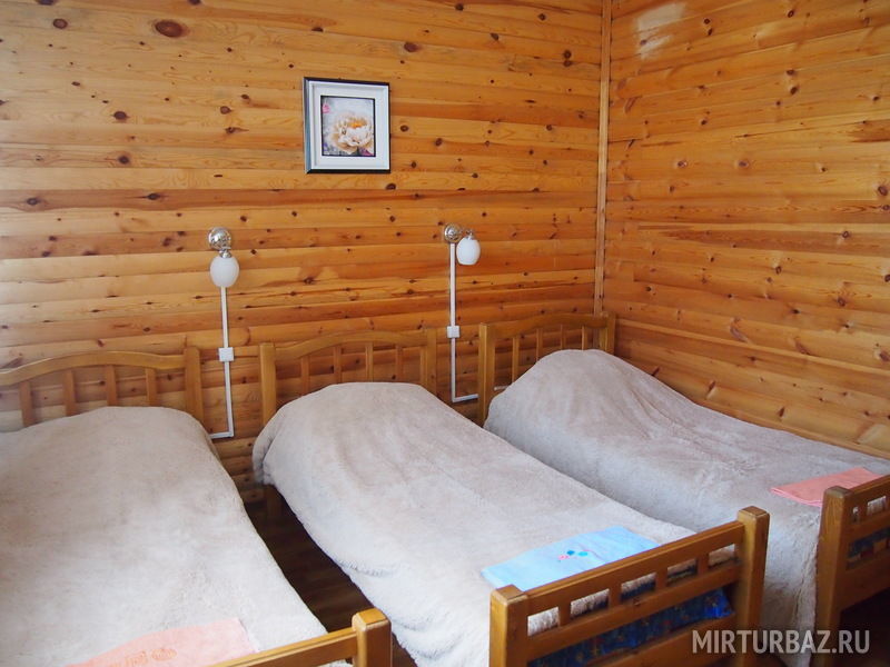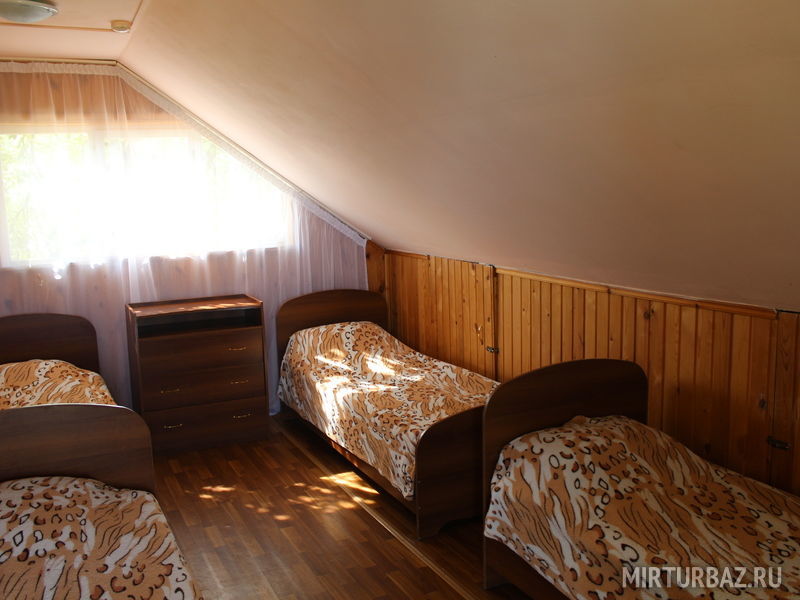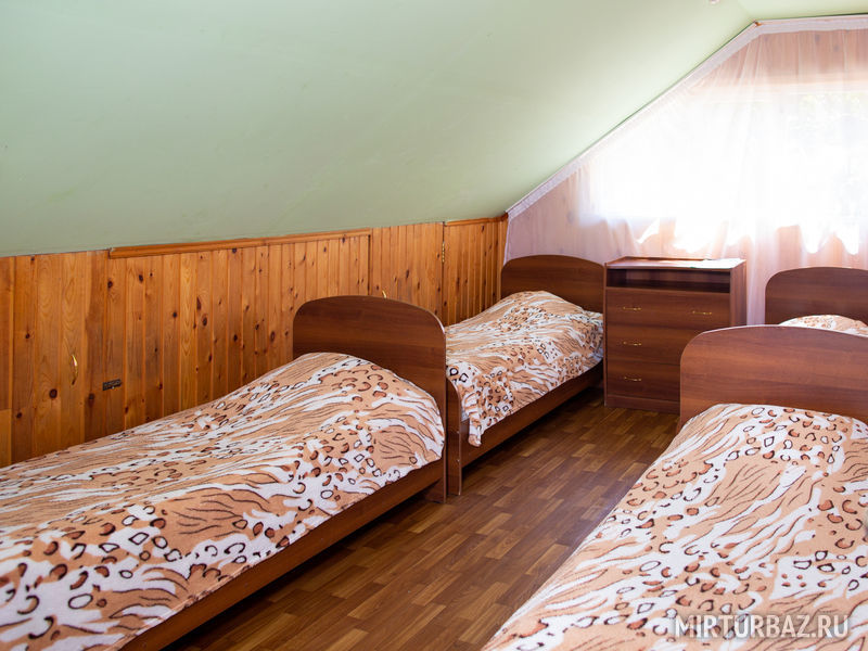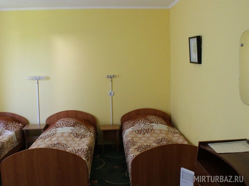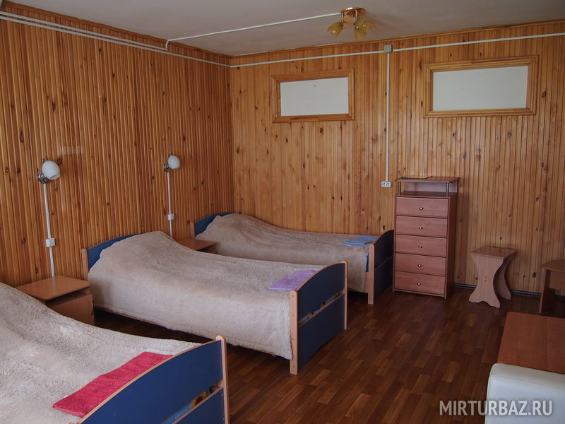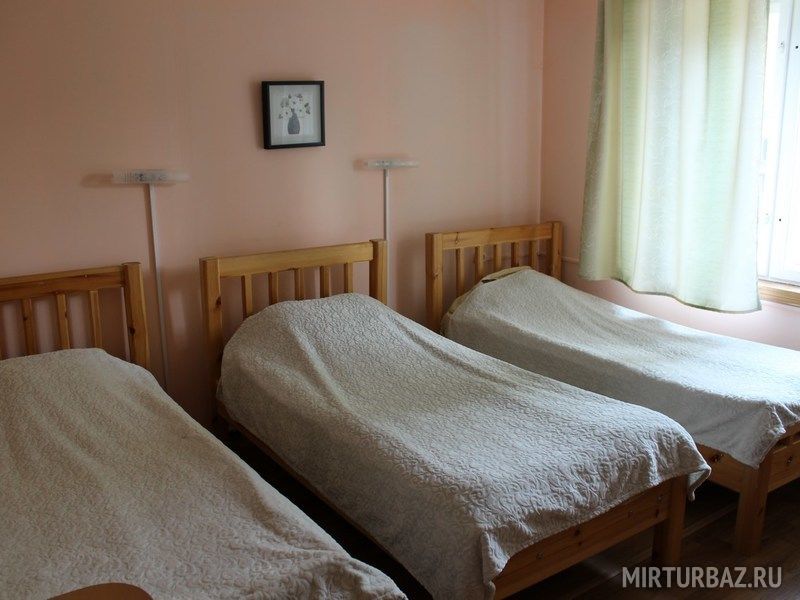 Трехместный номер расположен на первом этаже двухэтажного корпуса. В номере 3 полутора спальные кровати, комод, зеркало, тумбочка. Удобства для отдыхающих расположены на этаже.