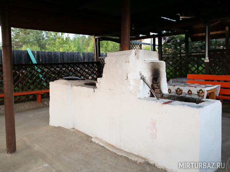 Зона барбекю оснащена большим мангалом на несколько компаний, который разделен на три секции, две из которых предназначены для готовки на углях и отдельным местом для готовки в казане.