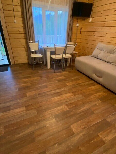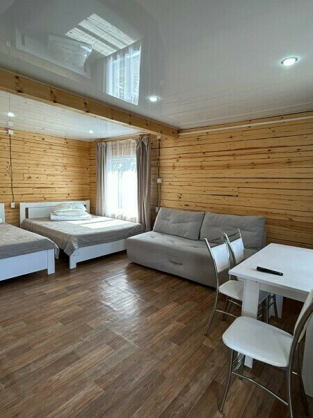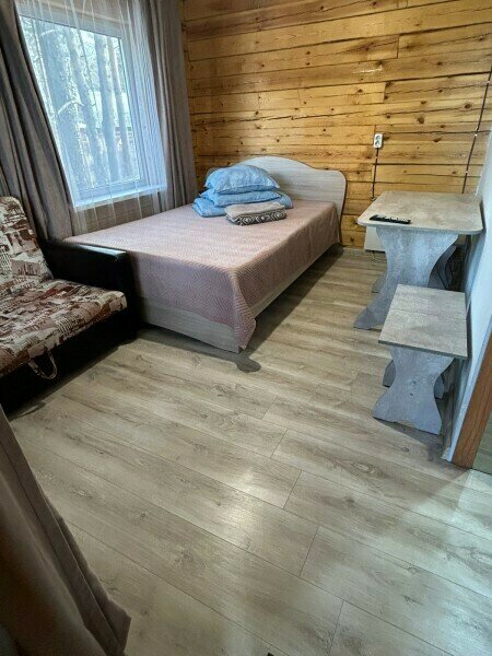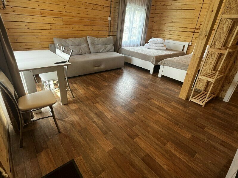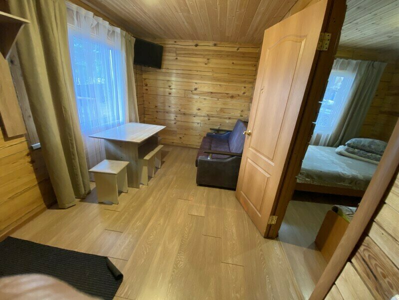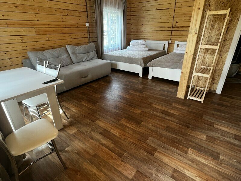 Малый семейный номер с отдельным входом. В номере есть всё необходимое для комфортного проживания и отдыха. Собственный санузел с туалетом и душем. Небольшой кухонный уголок с мини холодильником, плиткой, чайником и вся необходимая посуда. В номере двуспальная кровать, раскладной двухместный диван, телевизор с 20 каналами.