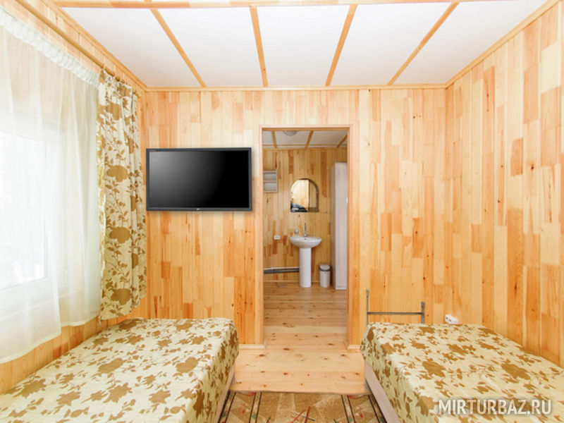 В номере: Две односпальные кровати, шкаф, стол, табуреты, чайник, ТВ, раковина с холодной водой.