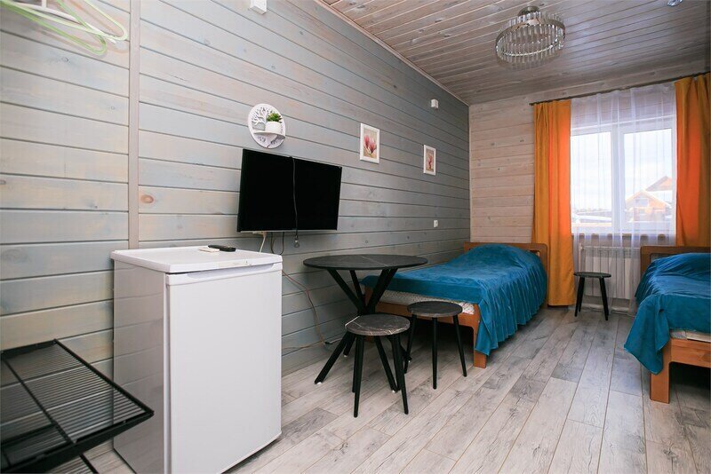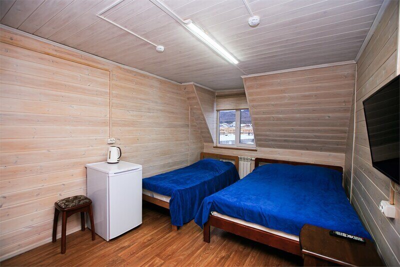 В номере две односпальные кровати, санузел c душем, холодильник, телевизор.
