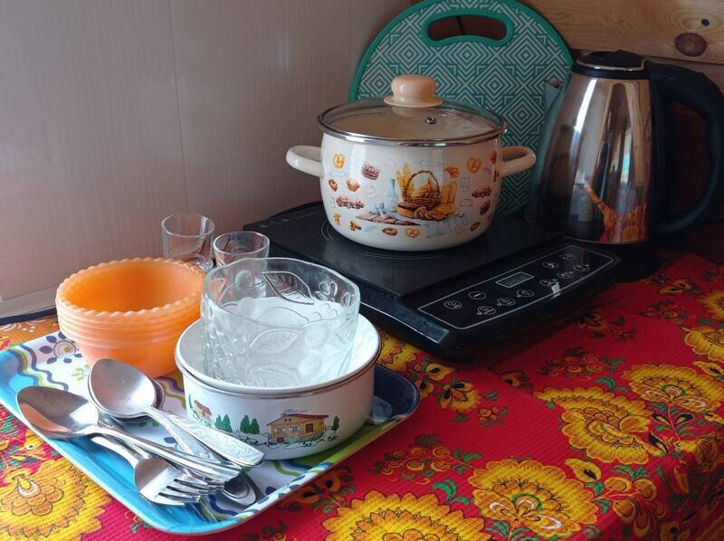 Оснащен телевизором, холодильником, индукционной плитой, чайником, необходимым набором посуды и душевым комплектом (набор полотенец, шампунь, гель для душа). В номере имеется совмещённый санузел (душ и водный биотуалет).