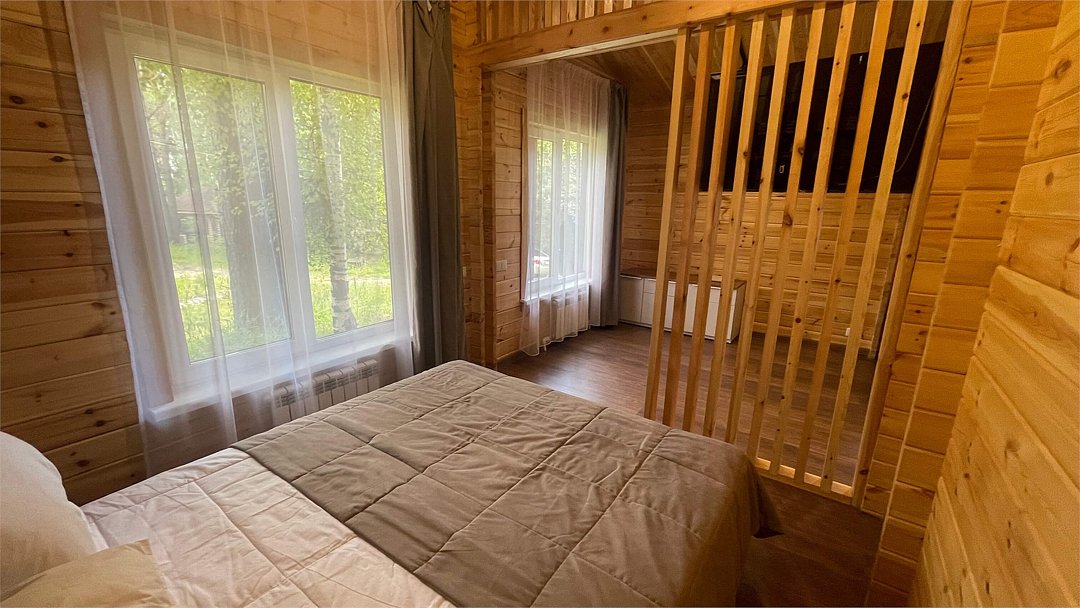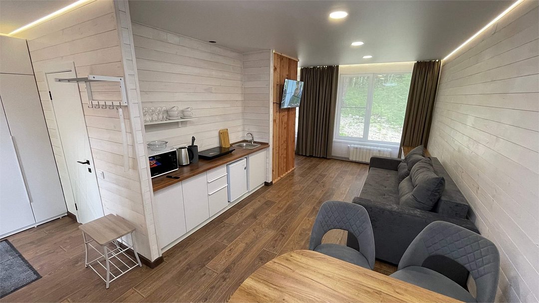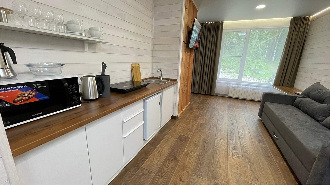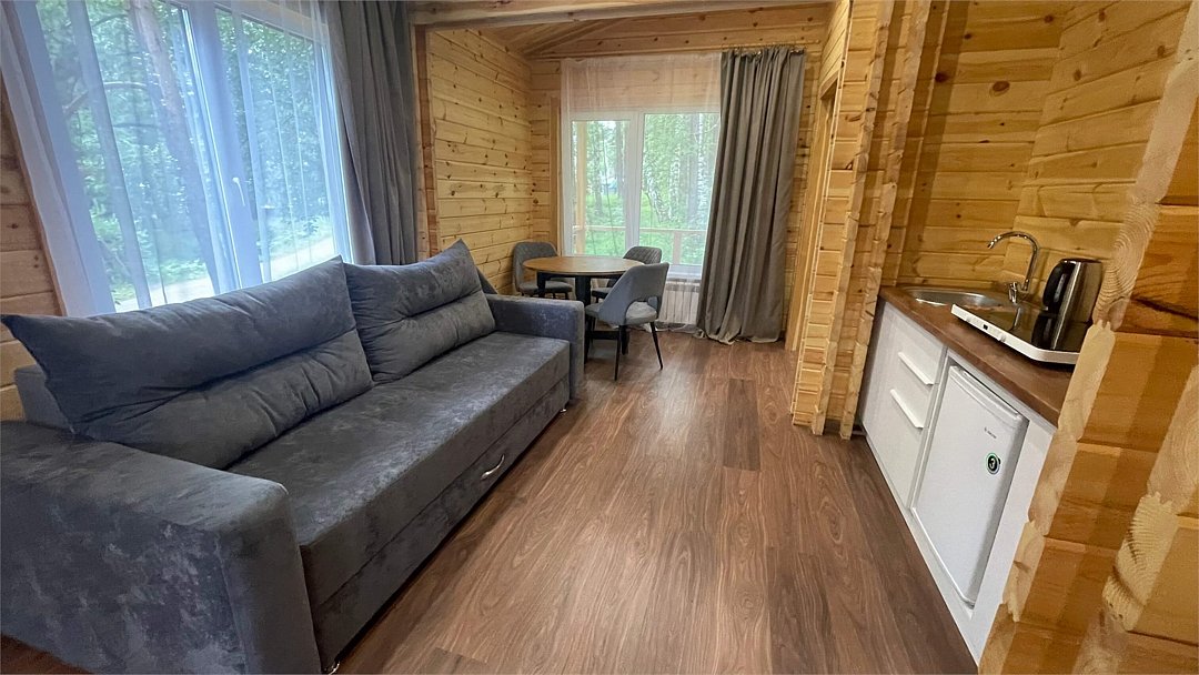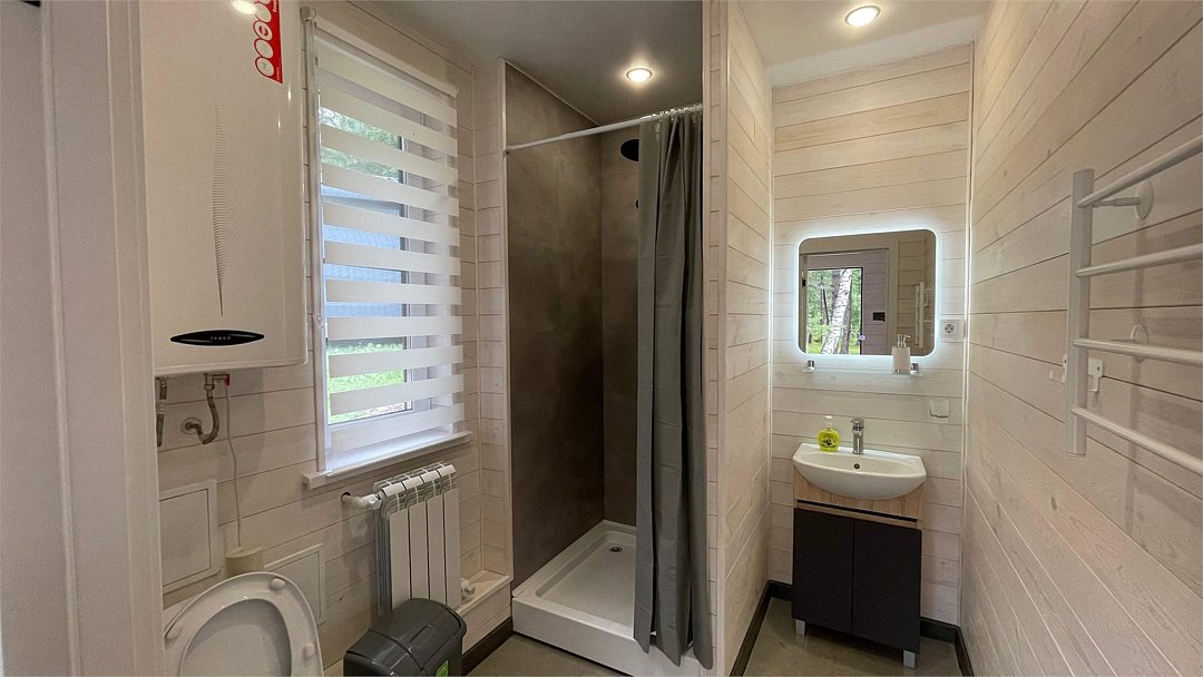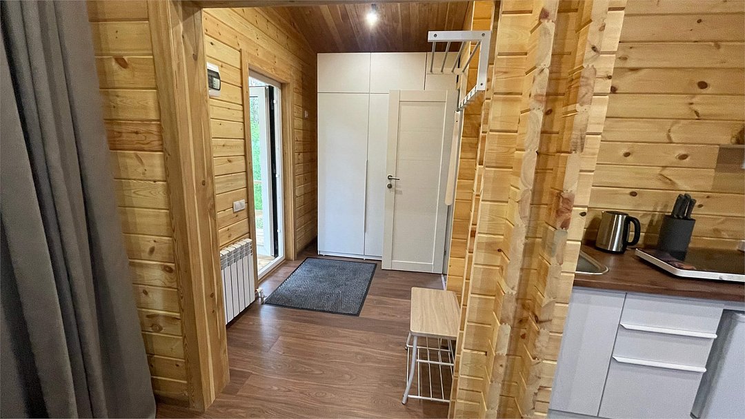 В домике имеется оборудованная кухня, обеденный стол, ванная комната с душевой кабиной, телевизор, Wi-Fi, тёплый пол.