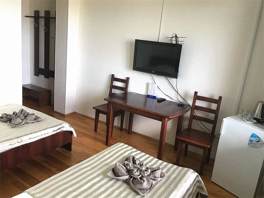 Две кровати: одна кровать — 1,4 м, вторая кровать односпальная — 90 см. Телевизор, холодильник, электрочайник, душевая кабина, водонагреватель, банные принадлежности, полотенца, обслуживание номеров.
