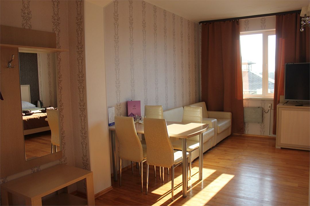 Мягкая диванная группа, двухстворчатый шкаф, телевизор, холодильник, электрочайник, посуда, халаты и тапочки, душевая кабина, водонагреватель, фен и банные принадлежности, кухонная зона, плита, терраса, балкон, санузел совмещенный, информационная карта, меню, обслуживание номеров.