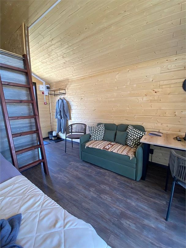 На первом этаже расположены кухня-гостиная и ванная комната, двуспальная кровать и раскладной диван, на втором этаже — дополнительное спальное место размером 140 на 200.