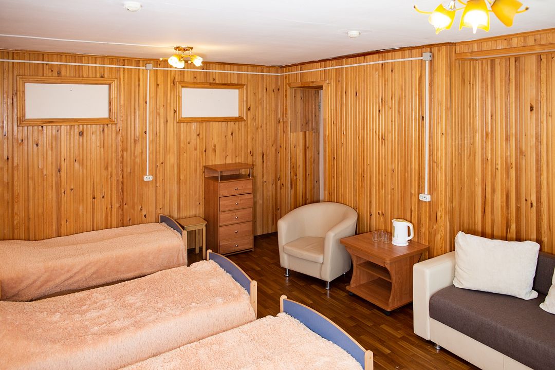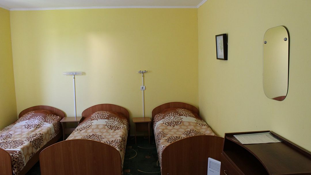 В номере имеется три кровати, диван, комод, журнальный столик, телевизор, зеркало, чайник.