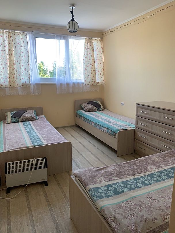 В комнатах имеются по 3 полутора спальные кровати, комод, зеркало, стол.