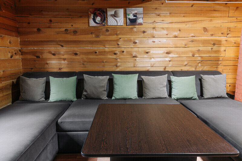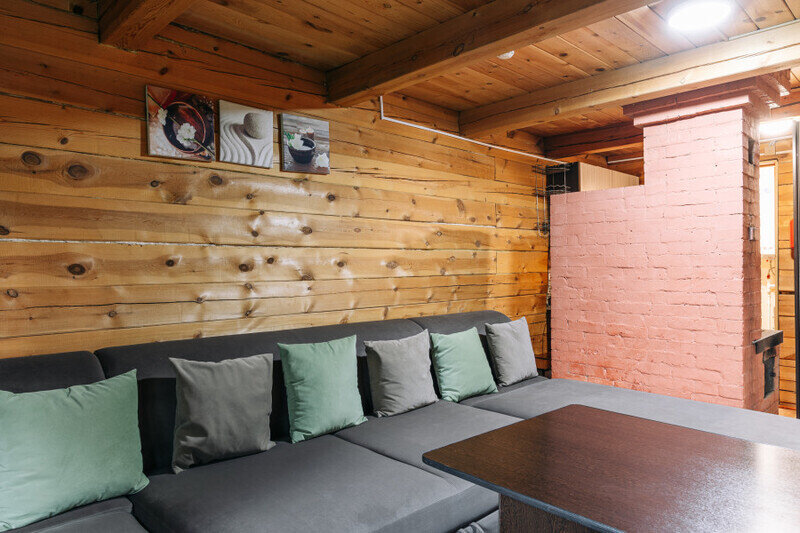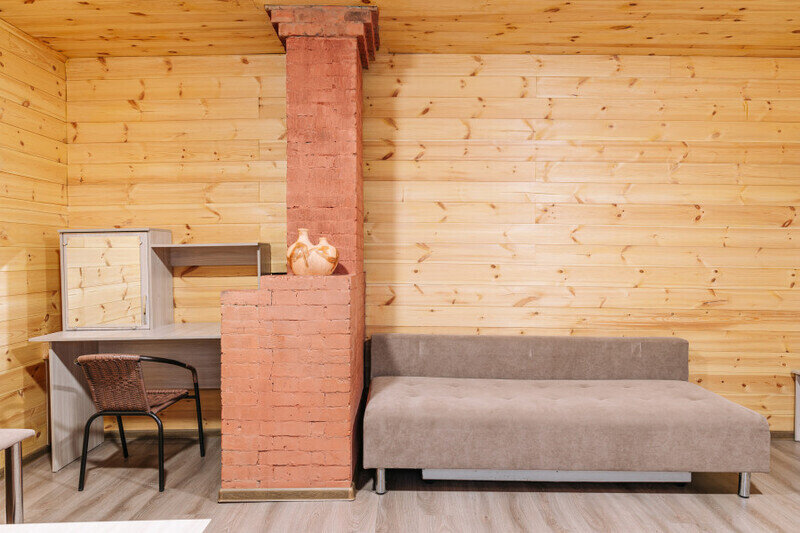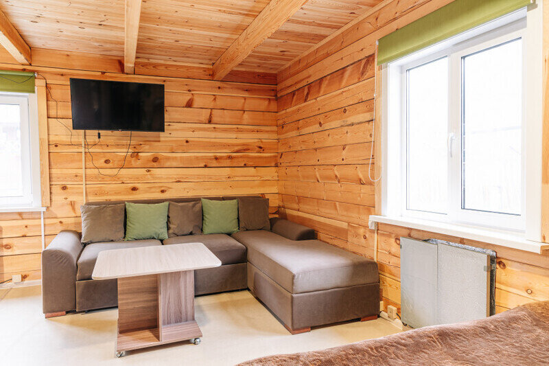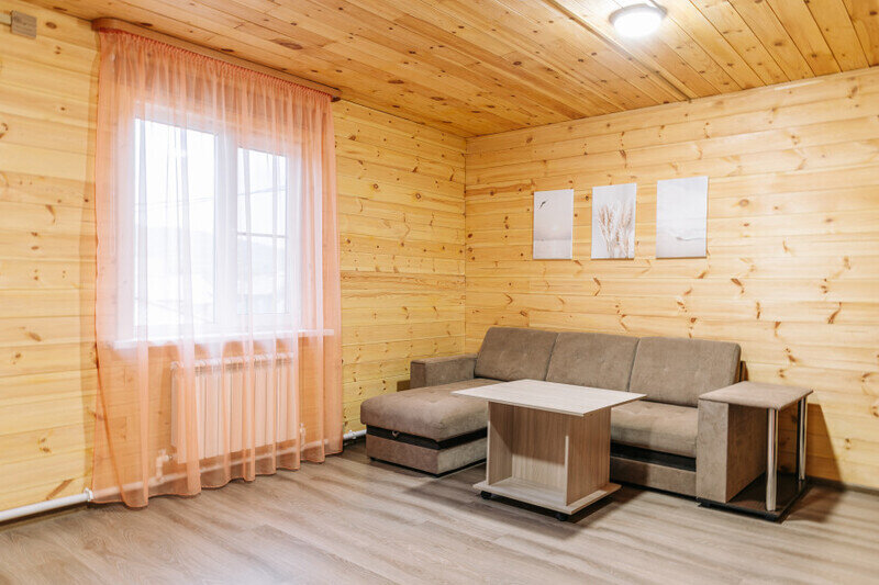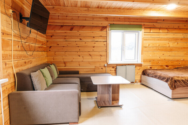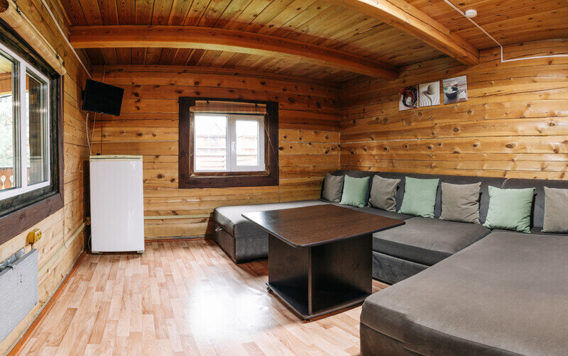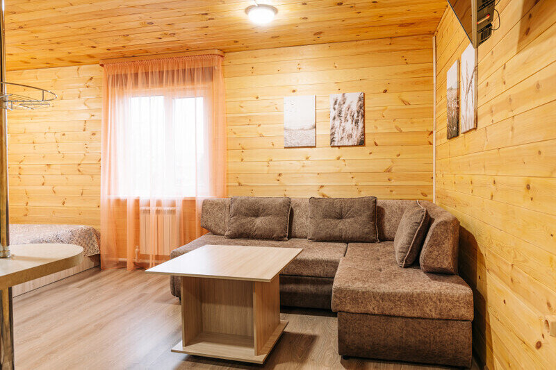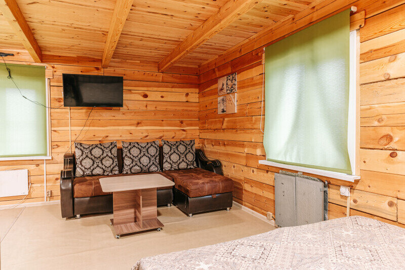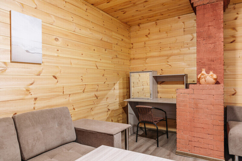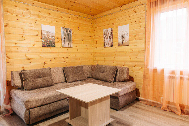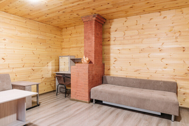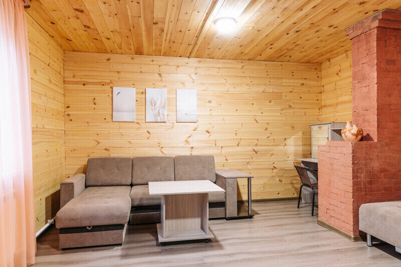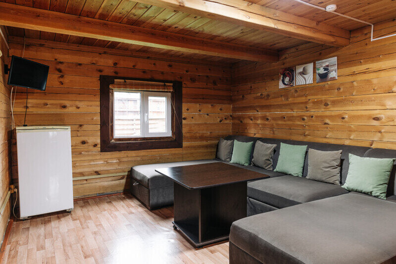 «ТАУНХАУС ЭКО» благоустроенный дом С ДРОВЯНОЙ ПЕЧЬЮ трехместный дом с террасой, с большим П-образным диваном, ванной комнатой и мини-кухне
