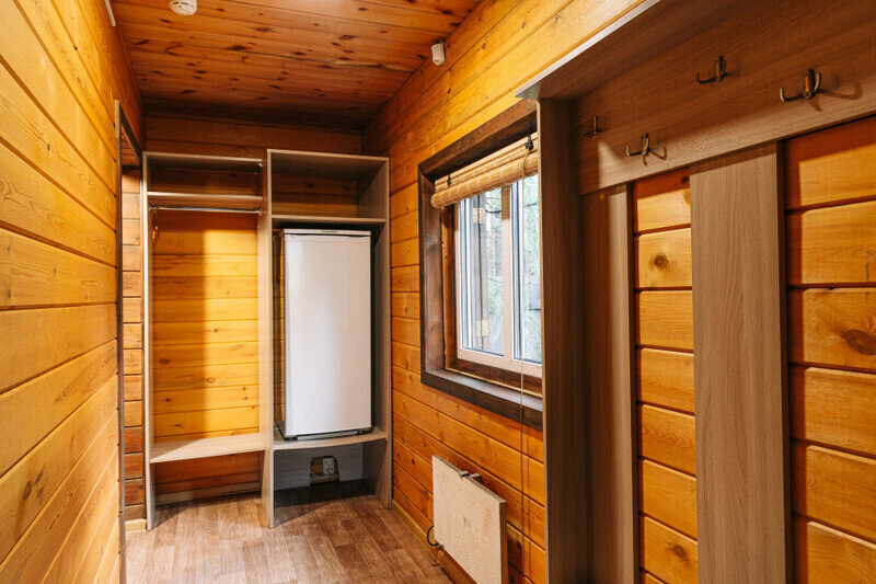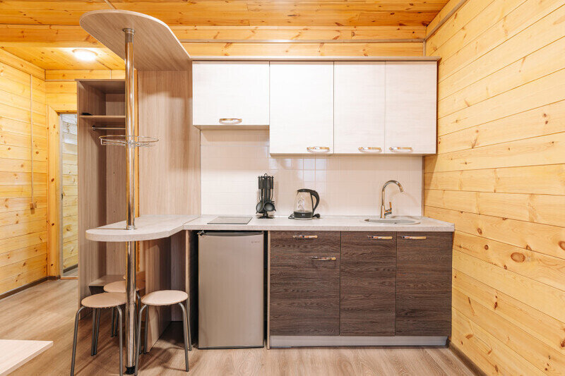 Компактный благоустроенный дом с двуспальной кроватью, ванной комнатой и мини-кухней.