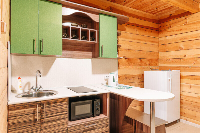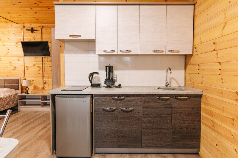 - кухня со всем необходимым для приготовления пищи (в т. ч. холодильник, электрочайник, посуда, варочная панель, микроволновая печь);
