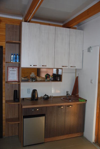 - кухня со всем необходимым для приготовления пищи, в т. ч. холодильник, варочная панель, электрочайник, посуда;