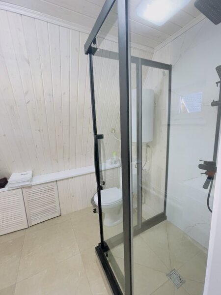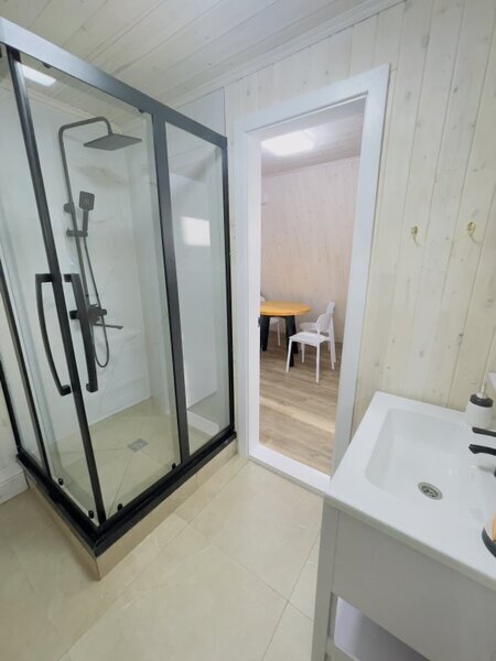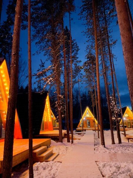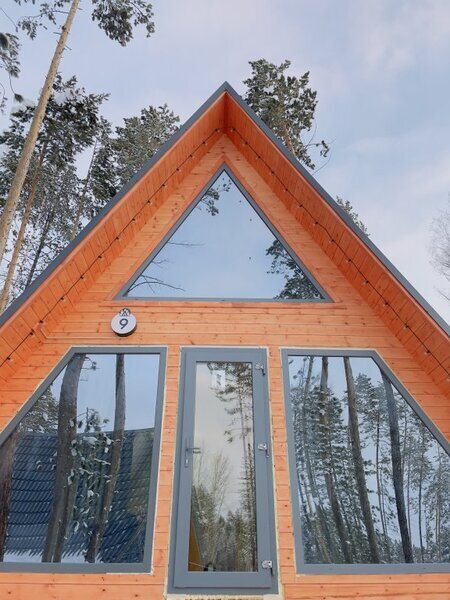 Уютный двухуровневый эко-домик в стиле А-фрейм с панорамными окнами в бирюзовом цвете, с теплыми полами и индивидуальной террасой. Выполнен из натурального дерева по современным технологиям. На первом этаже расположены гостиная и ванная комната, на втором этаже - спальня. В ванной - косметические и гигиенические принадлежности. В гостиной зоне - удобный раскладной диван, ТВ. В спальне на втором этаже - две раздельные кровати с возможностью соединить в одну большую семейную кровать. На открытой террасе деревянные кресла.