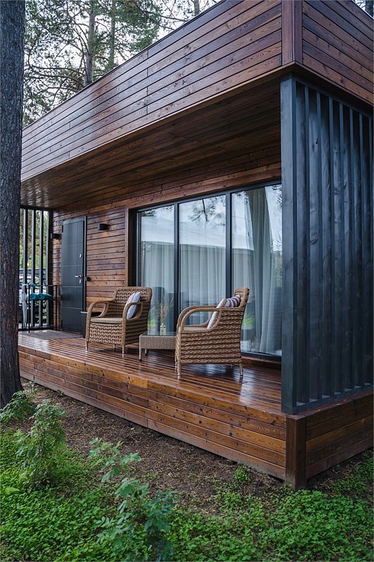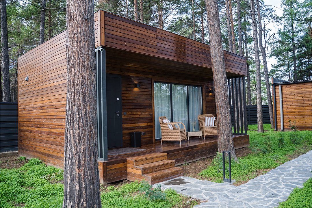 Домики повышенной комфортности, с авторским дизайном. - собственная терраса с панорамными окнами и видом на байкальскую природу; - двуспальная комфортабельная кровать; - прикроватные лампы; - прикроватные тумбы; - шторы Blackout; - шкаф для личного гардероба; - чайный столик с кофемашиной и чашками; - стулья; - ковровое покрытие; - душ; - раковина; - санузел; - зеркало; - наборы для личной гигиены; - дополнительное спальное место - еврораскладушка; - услуги горничной.Услуги и удобства