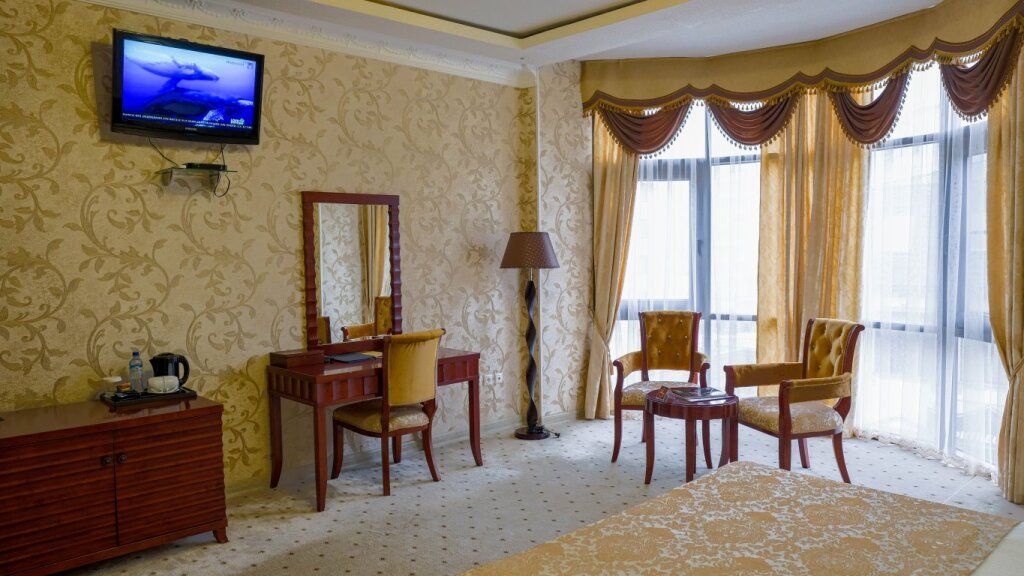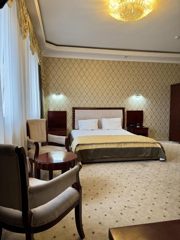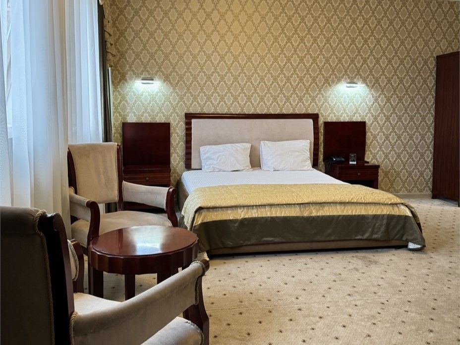 Номер Полулюкс представляет собой улучшенный номер 1 класса, как по площади, так и по оформлению интерьера. Здесь более интересная, в том числе и мягкая, мебель, большой простор . Как в любых номерах 1 класса, гостиная, кабинет и спальня находятся в одном помещении и лишь разделены нишами или пространством. Легкие и тяжелые шторы прекрасно дополняют интерьер и придают номеру Полулюкс особую изысканность. Широкая двуспальная кровать, приятное освещение, живые комнатные растения, бесплатный доступ в сеть Интернет. Номер выполнен в спокойных песчаных тонах.