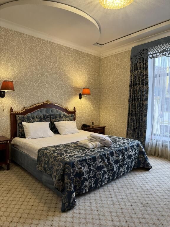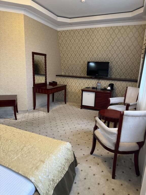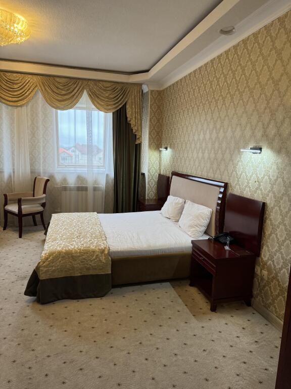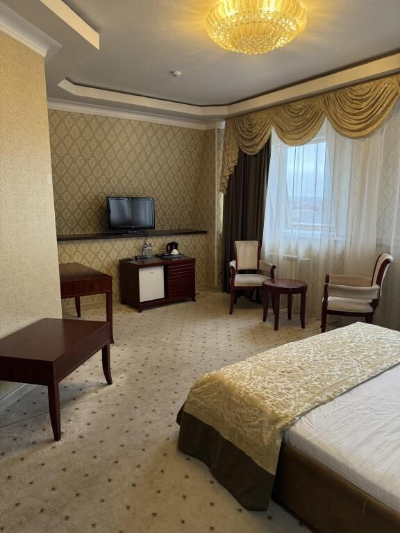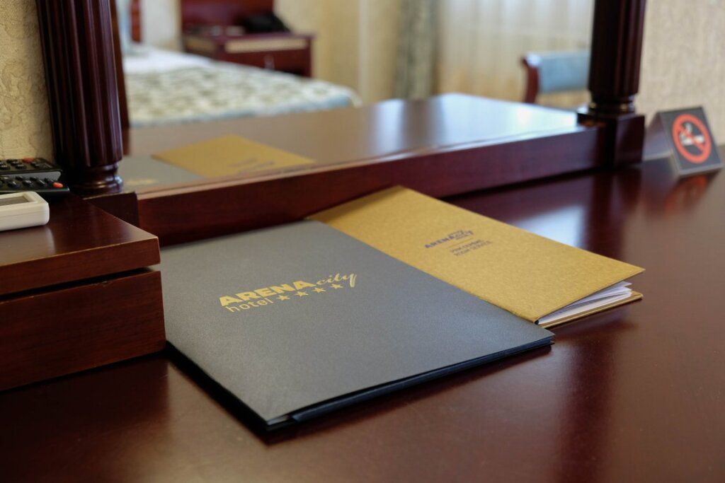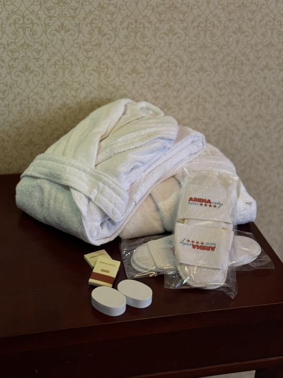 Письменный стол и рабочее кресло. Приятная цветовая гамма номера: пастельные светло-коричневые, кремовые тона. Кровать стандартного номера соответствует размерам кровати в номере люкс. В отеле Арена-Сити найдутся номера 1 класса и с двумя раздельными кроватями.