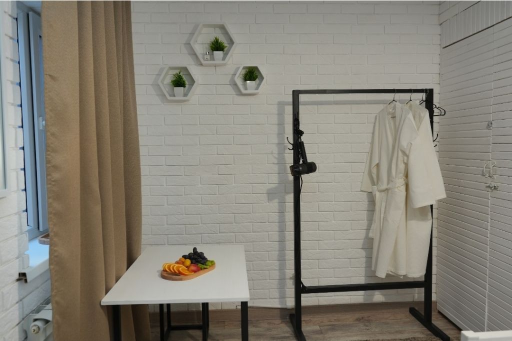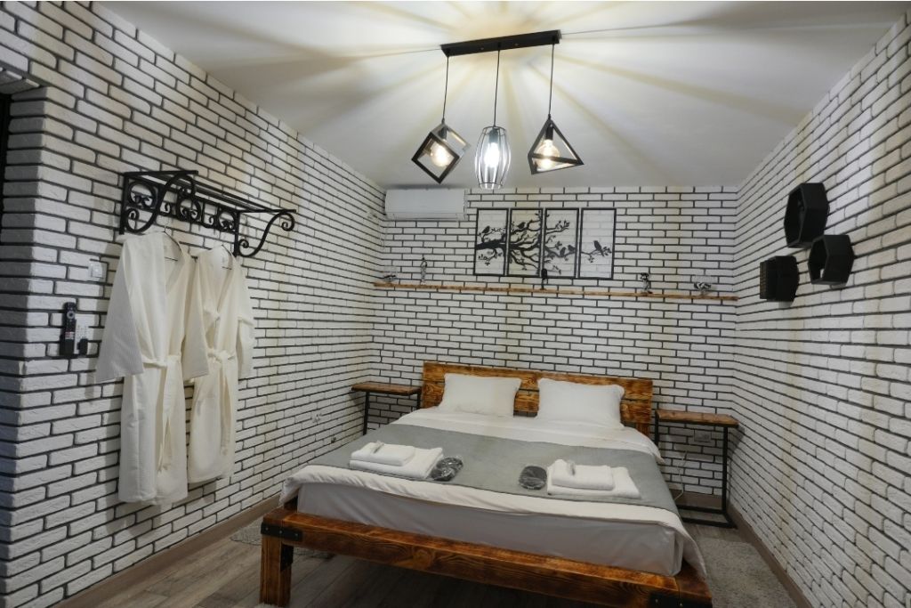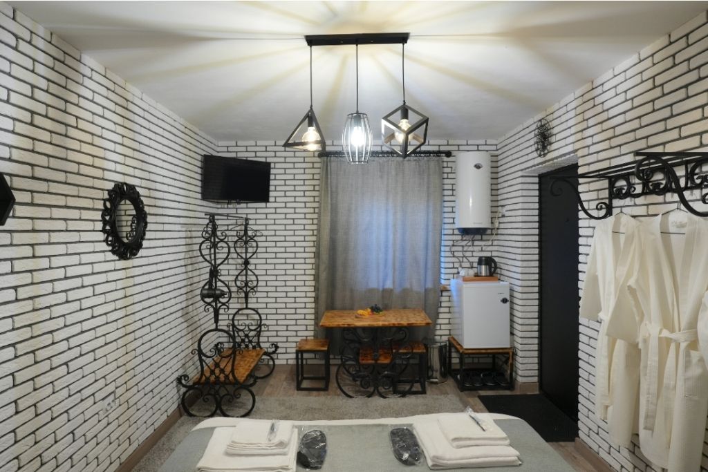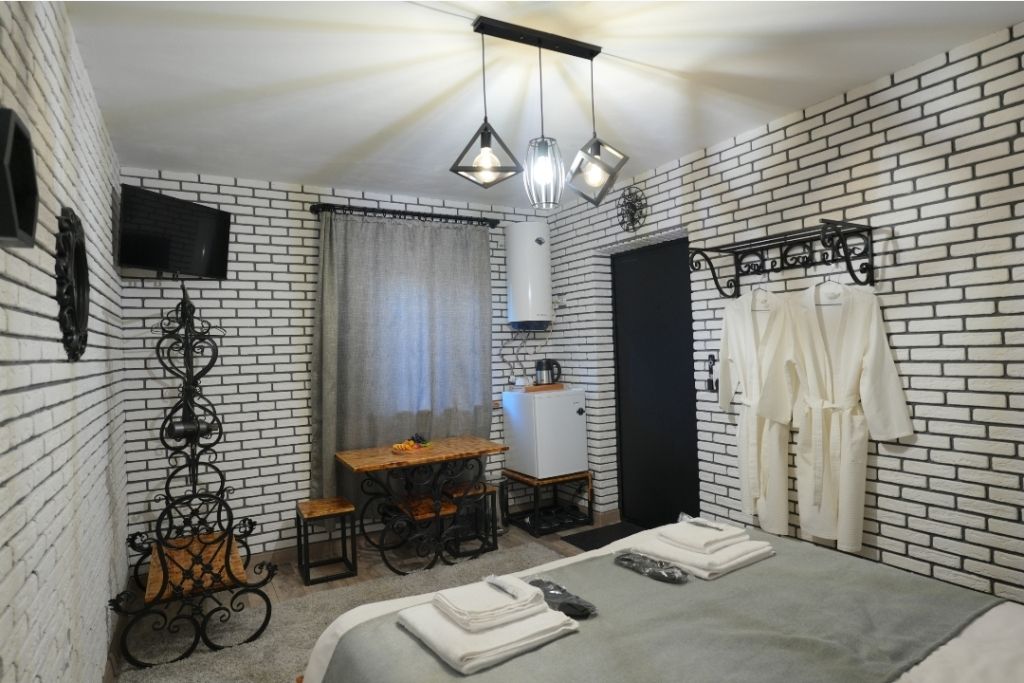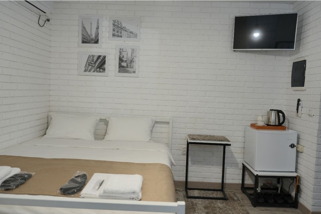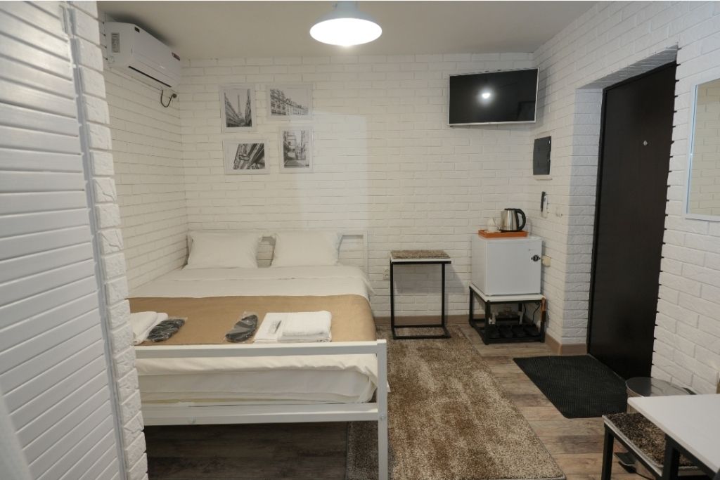 Номера включают в себя: телевизор, холодильник, кондиционер, чайник, фен, халаты, полотенца, постельное бельё, тапочки и предметы личной гигиены.