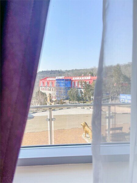 Вид из номера: панорама на Кавказский хребет, внутренняя территория курорта и холмистая лесопарковая местность.