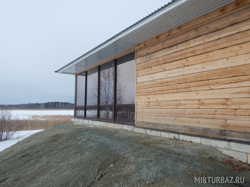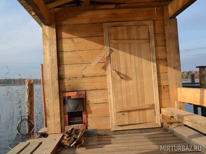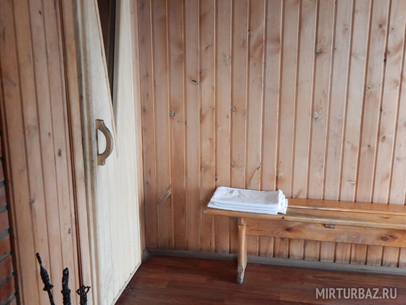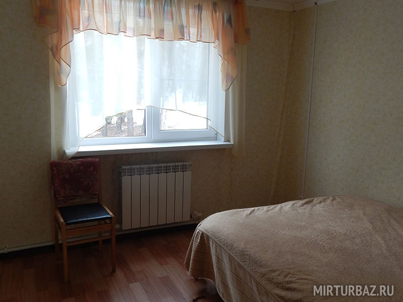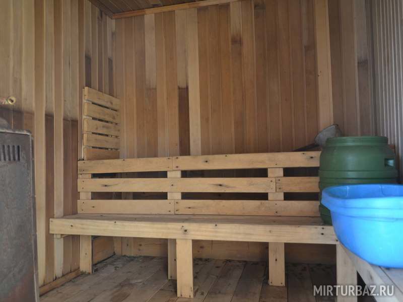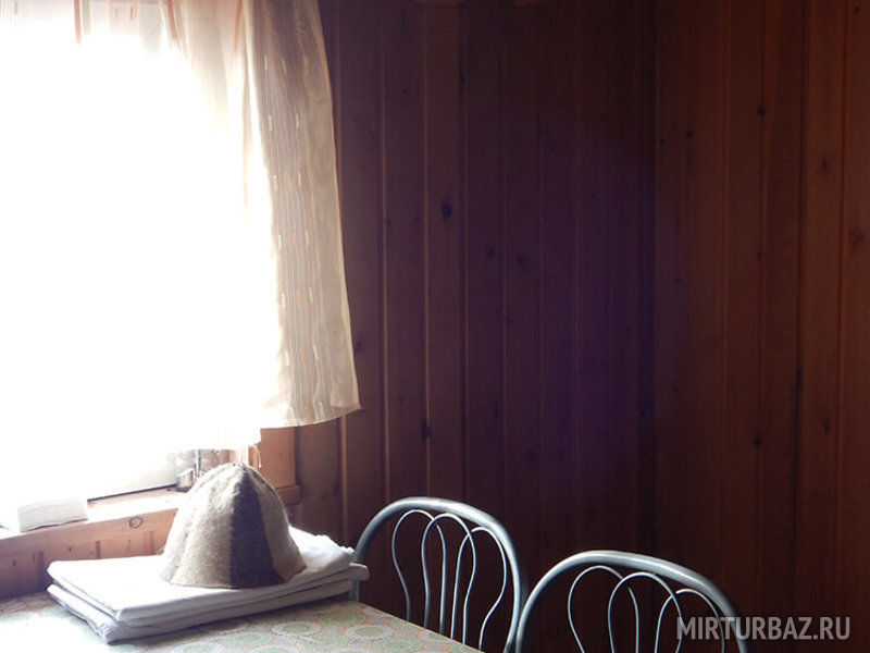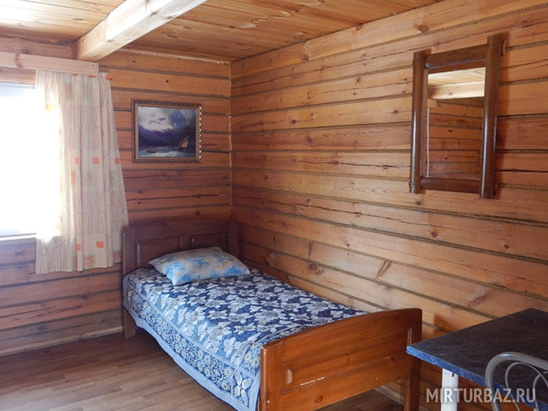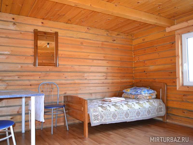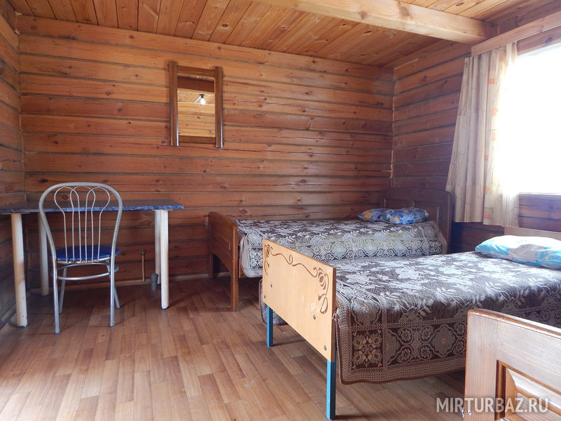 В комнате имеется одна 2-х спальная кровать, стол, 2 стула и окно. Удобства на территории базы.