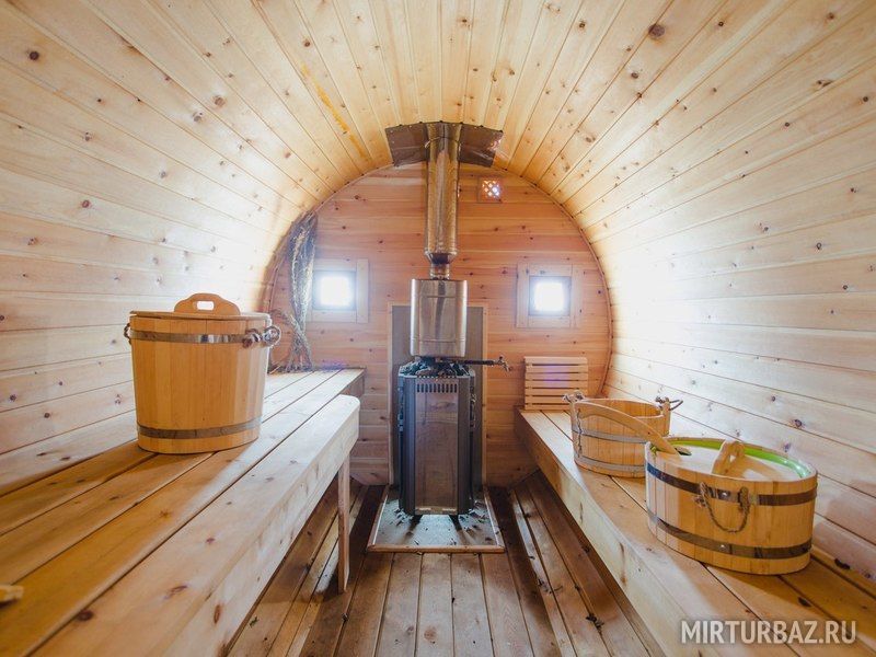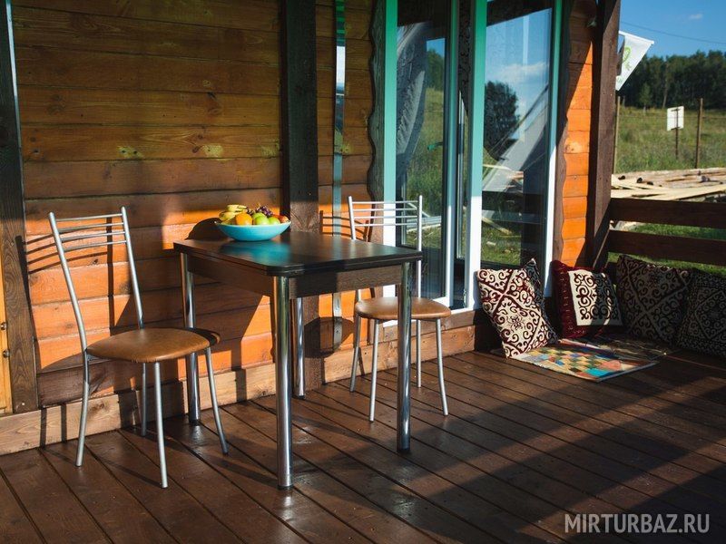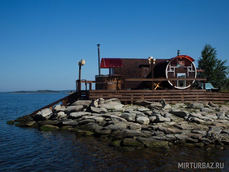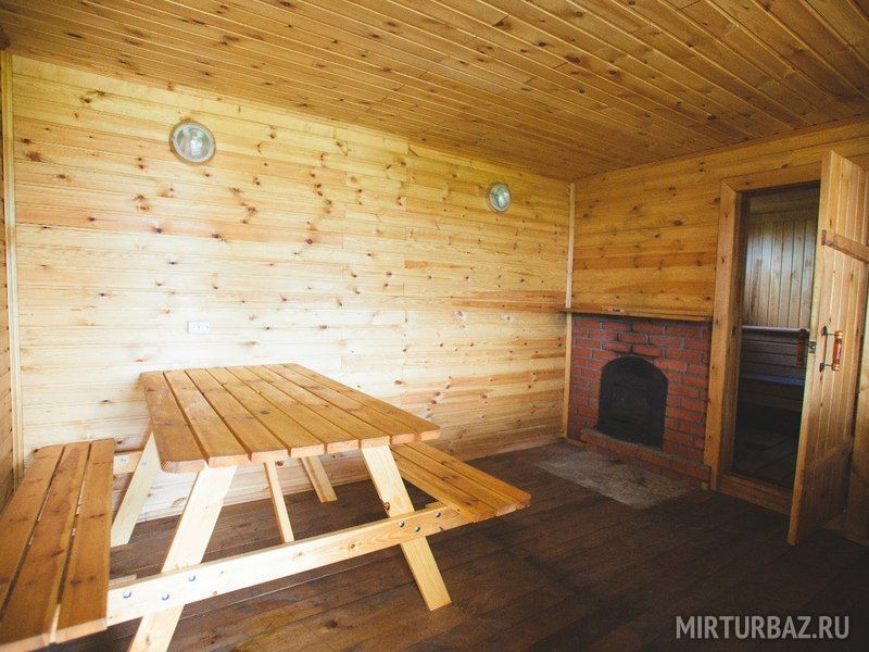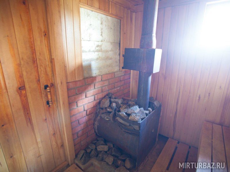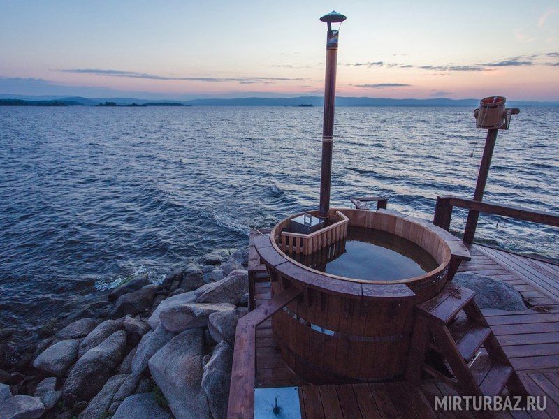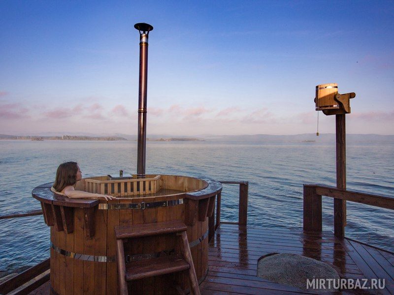 Баня на дровах. Внутри парилка, отдельная комната отдыха с видом на озеро Аргази и отдельный санузел. Снаружи есть два деревянных ведра и индивидуальный заход в озеро. А также японская купель Фурако из настоящего кедра и дуба, нагреваемая дровяной печью.