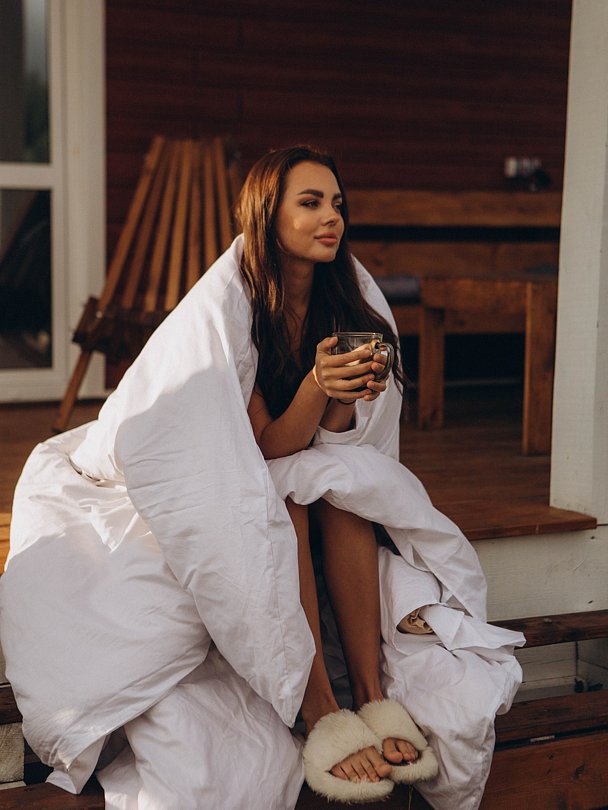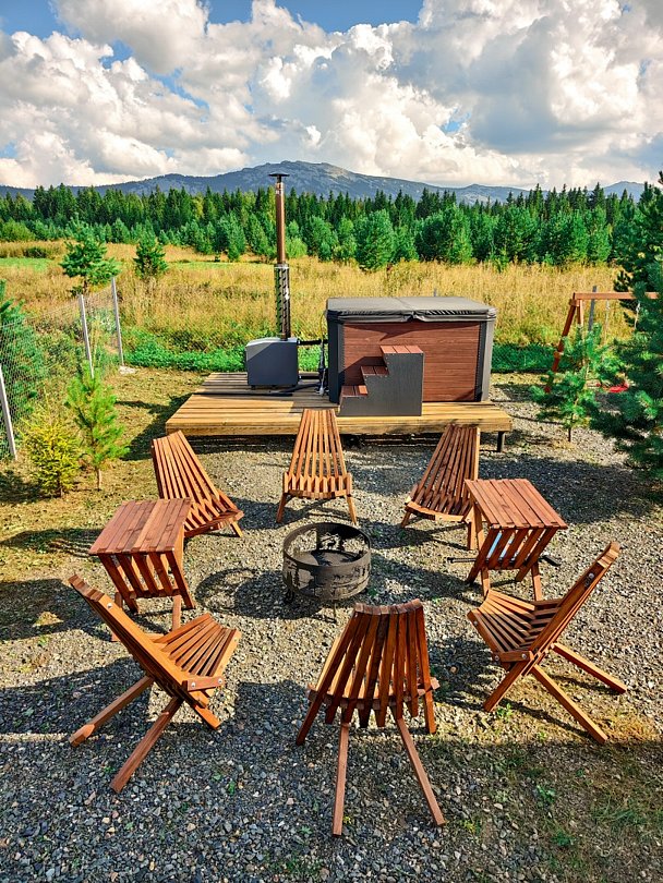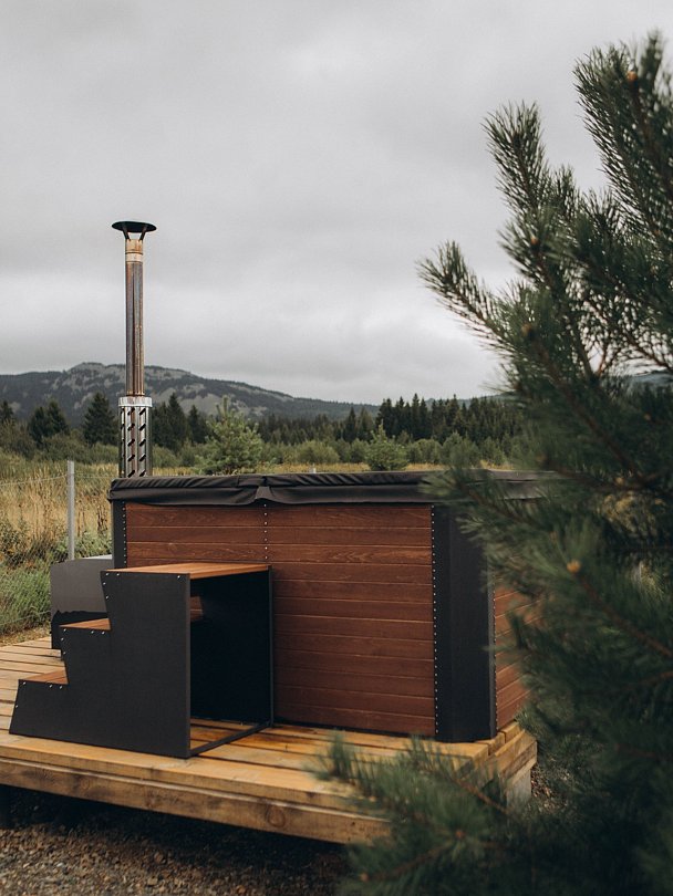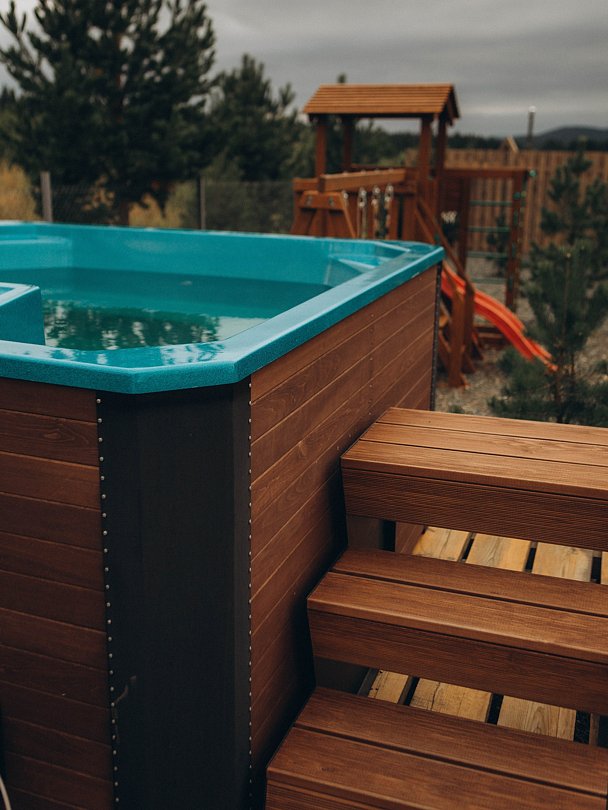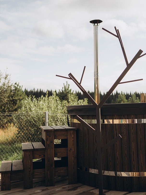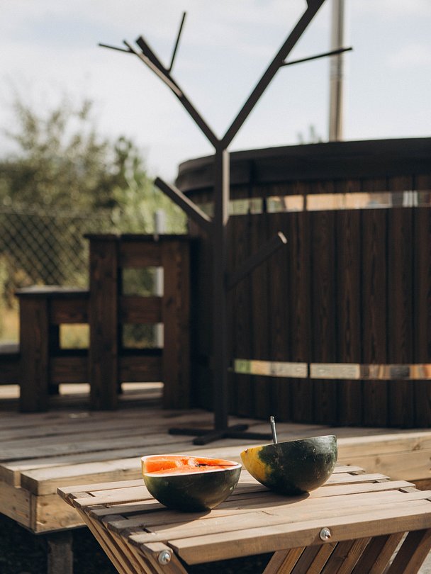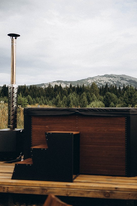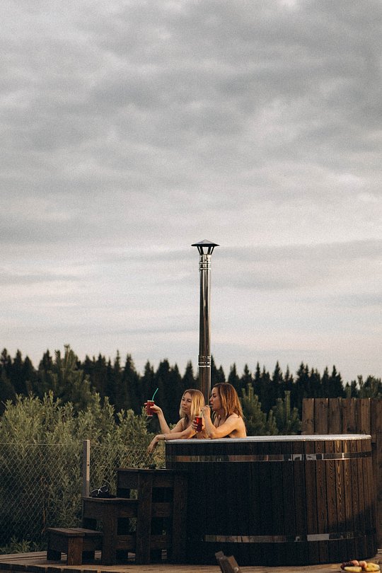 Премиальная купель Фурако большого размера расположена в шаговой доступности от дома «Брусника». Здесь можно насладиться целебным паром на свежем воздухе, погрузиться в атмосферу умиротворения и любоваться живописными видами, окружающими базу отдыха.