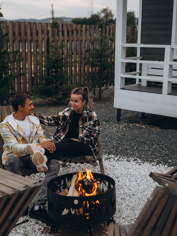 На закрытой территории каждого дома предусмотрена костровая зона — отличная возможность провести время с семьей у огня и насладиться уютной атмосферой.