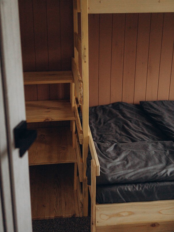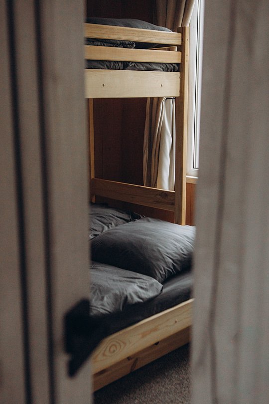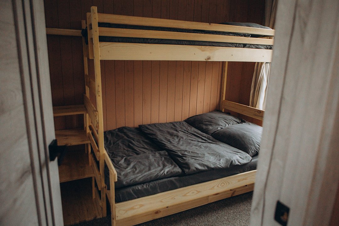Спальные места: в одной комнате располагается большая двухместная кровать, во второй — детская комната с двухъярусной кроватью, вместимостью до трех детей.