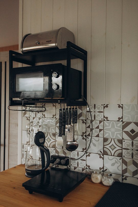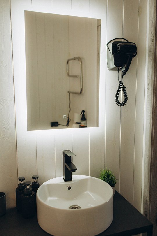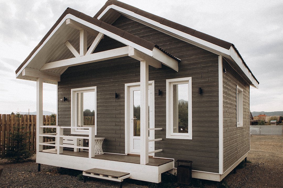 Это современный дом Сканди-мини (50 м²). Для круглогодичного проживания вместимостью до четырех-пяти человек. Дом оборудован всеми необходимыми для проживания электроприборами. Вода горячая, холодная — питьевая.