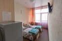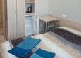 В номере 2 односпальные кровати, шкаф для одежды, тумбочка, табурет, зеркало, ТВ, мини-холодильник, чайник, санузел-душ, постельное белье, полотенца, мыльные принадлежности, балкон (на первом этаже лоджия), вид на площадку.