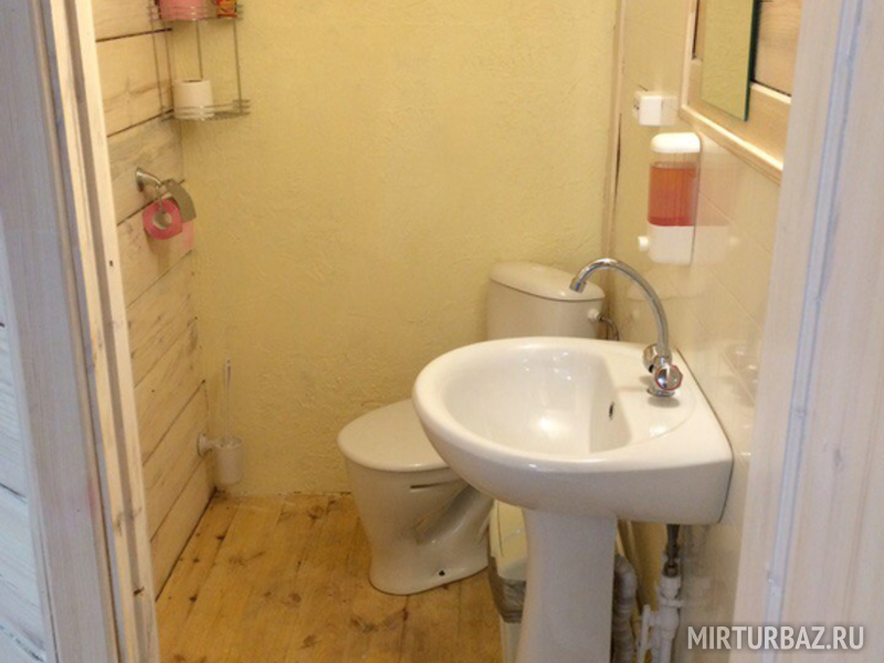 На первом этаже: кухня (холодильник, плита) два санузла с теплыми полами, 2 комнаты по 6 мест.