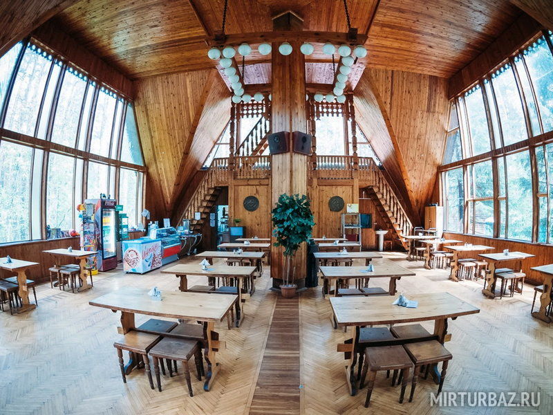База отдыха «Русь» предлагает 3-х разовое питание в обеденном зале с панорамными окнами. Вкусное питание с утра и до вечера! Зал рассчитан на 80 человек. А также в столовой можно приобрести продукты питания по доступным ценам: замаринованное мясо для шашлыка, овощи, напитки, чипсы, шоколад, мороженое и другие продукты.
