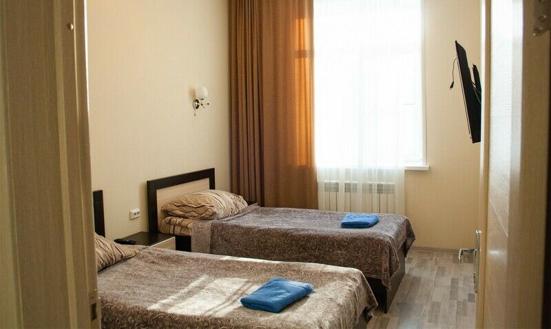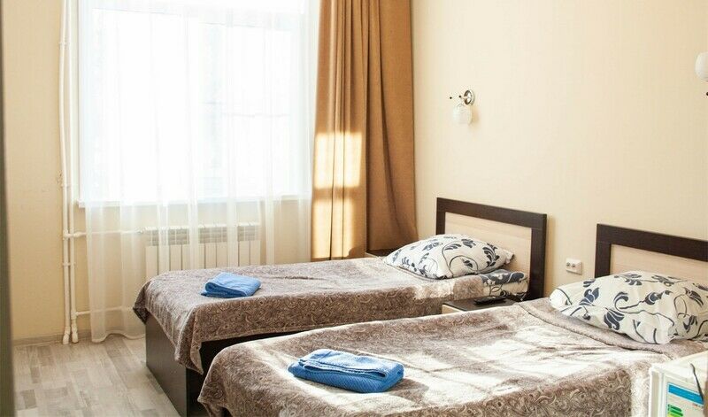 Односпальные кровати, холодильник, посуда, зона отдыха, стол, стулья, вешалка, постельные принадлежности.