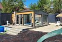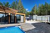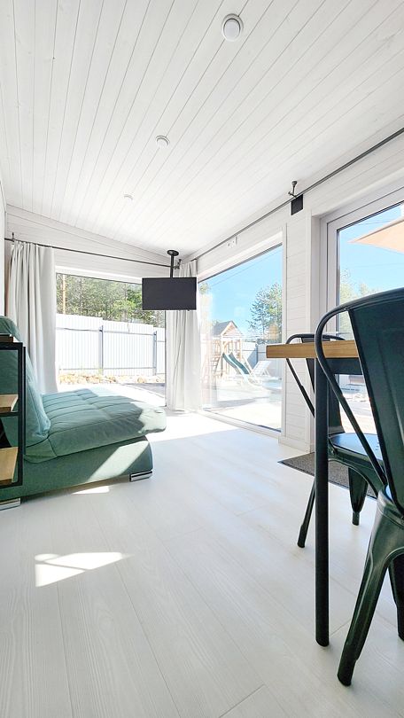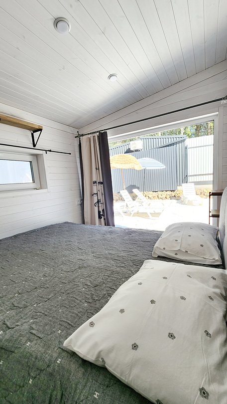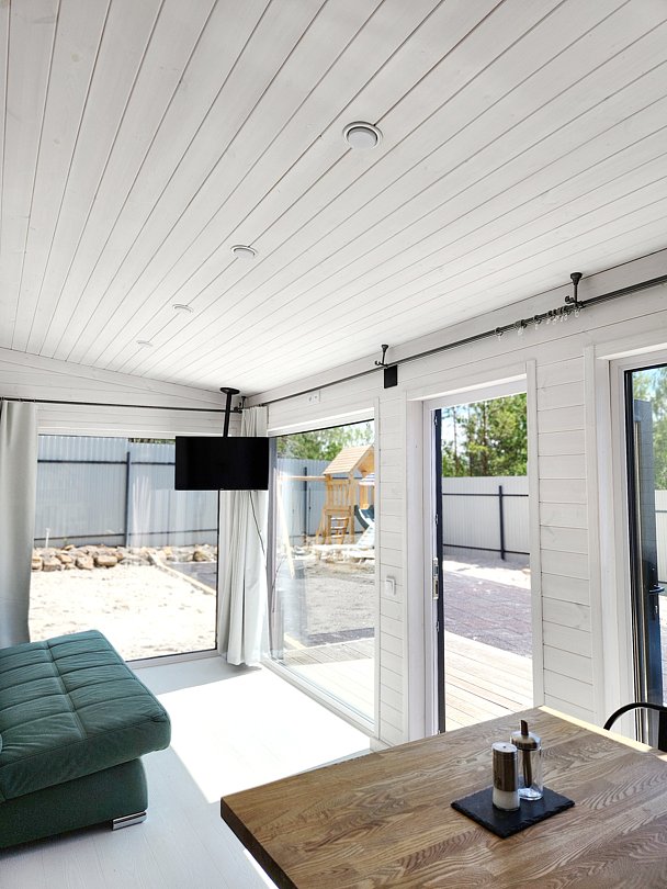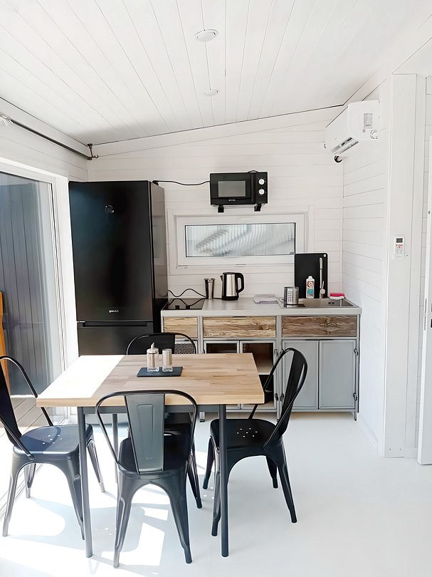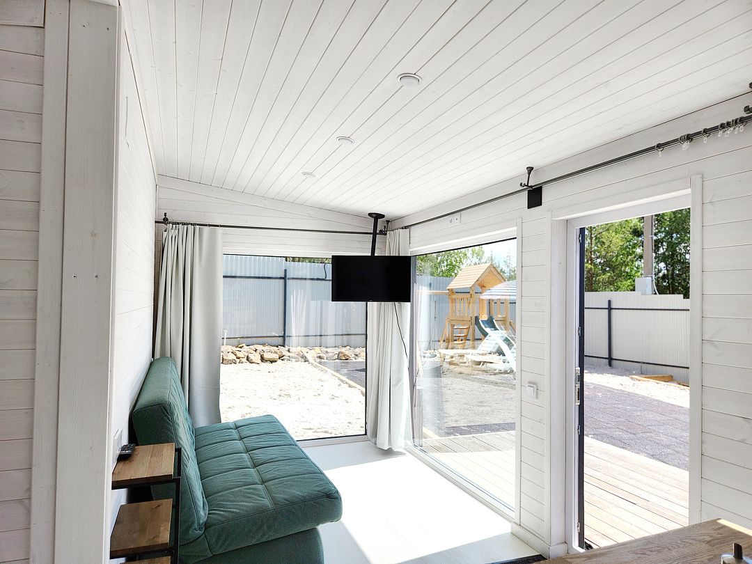 В доме находится все необходимое для четырех гостей. Специально выполнен с большим количеством панорамных стен, чтобы родителям было удобно смотреть за маленькими детьми играющими на территории.