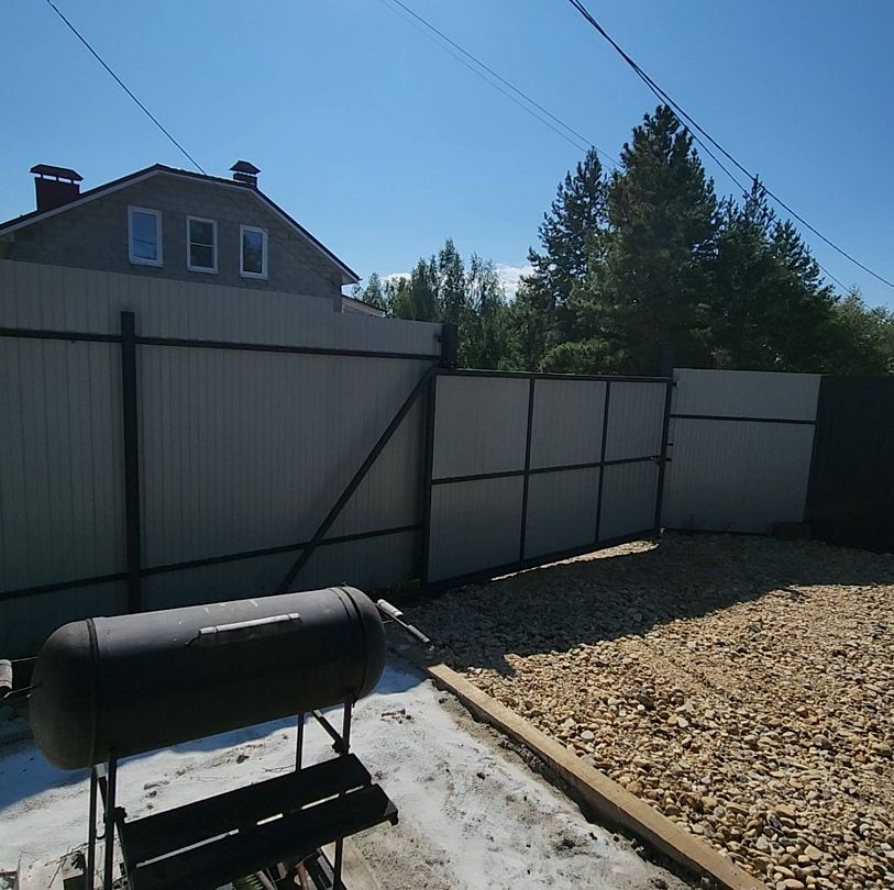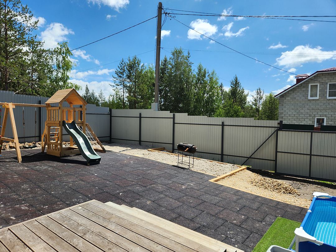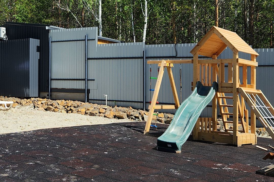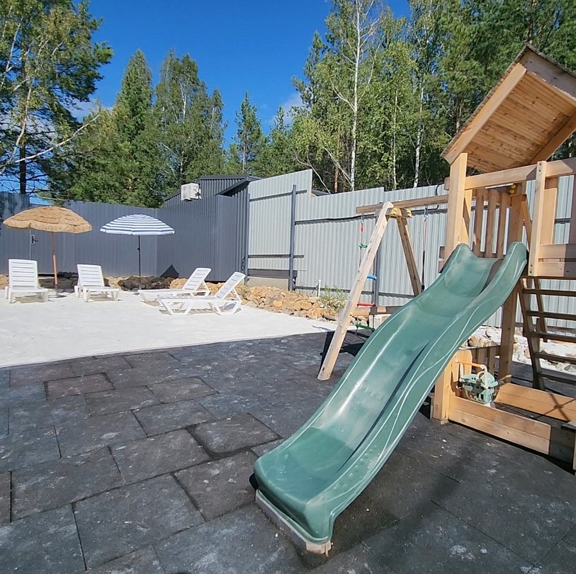 Участок: песок с дорожками выложенной резиновой плиткой для большей безопасности детей, детская площадка с горкой и двумя качелями, а так же качели можно поменять в зависимости от возраста детей.