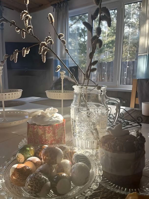 Что есть в доме: газовая варочная 4х конфорочная поверхность, эл. духовой шкаф, микроволновая печь, кастрюли (1,2,5 литров), сковородки (блинницы нету). Салатники, сервировочная посуда. Для 8 персон: тарелки, бокалы, стаканы, ложки, вилки, ножи, кружки, тарелки десертные, тарелки для вторых блюд, суповые тарелки.