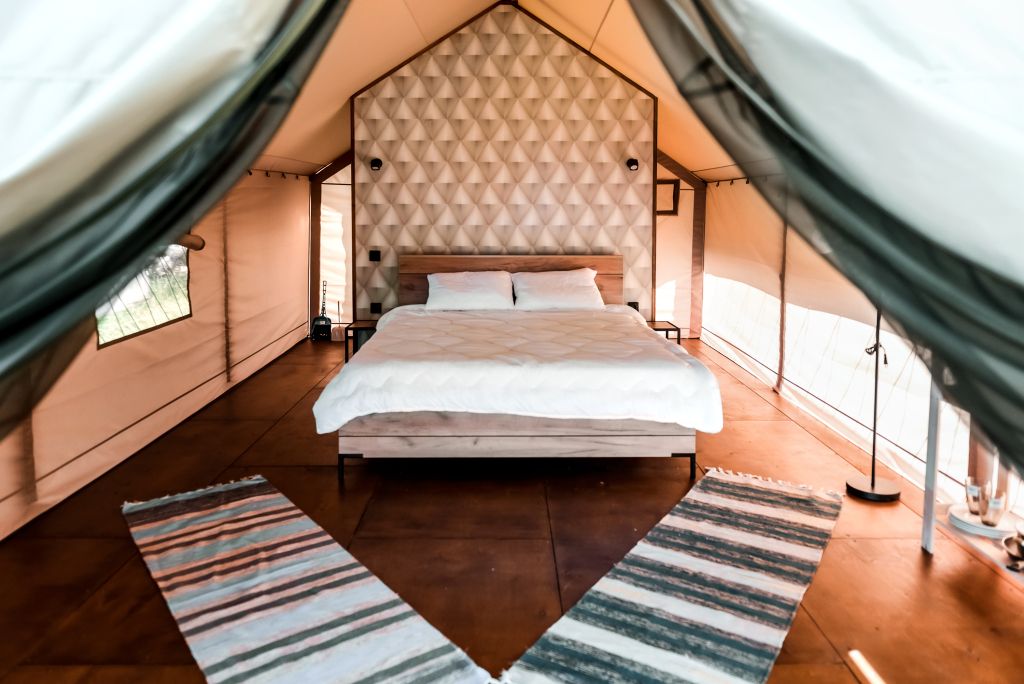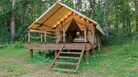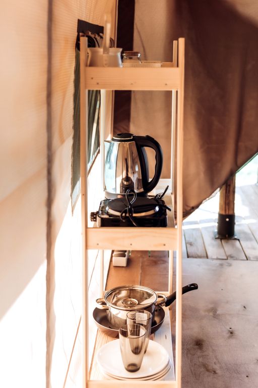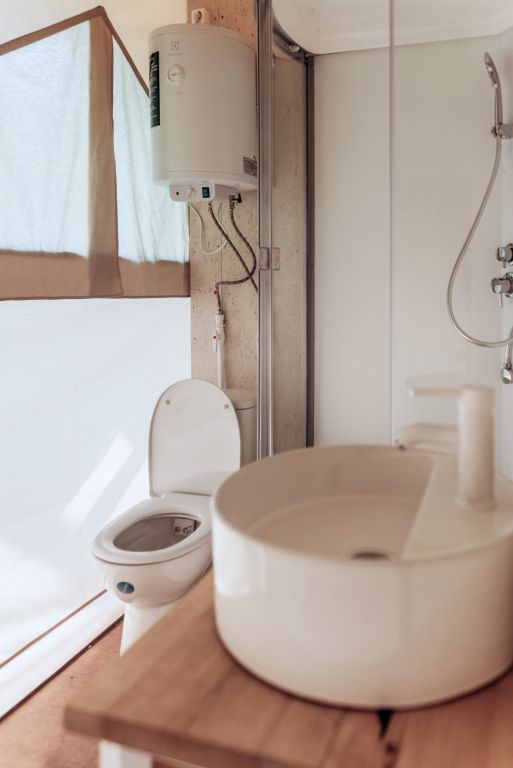 На территории глэмпинг-парка Дикари находится 9 глэмпингов. В каждом сафари-тенте вас ждет: удобная двуспальная кровать, туалет,душ, холодильник, посуда, плита, чайник, стол и стулья, кресла, обогреватель, родниковая вода, розетки и шкаф.
