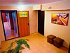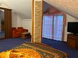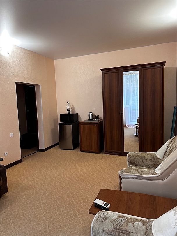 В номере: двуспальная кровать, раскладные кресла, шкаф для одежды, журнальный столик, пуфики, чайник, мини-холодильник, чайник, сушилка для одежды.