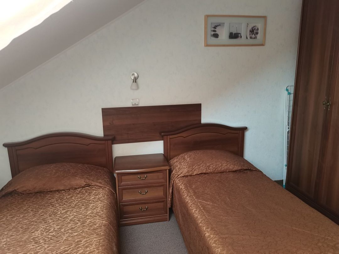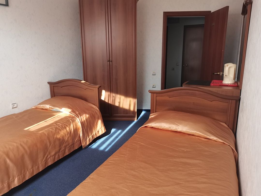 В номере: две односпальные кровати, шкаф для одежды, журнальный столик, пуфики, чайник, мини-холодильник, чайник, сушилка для одежды.