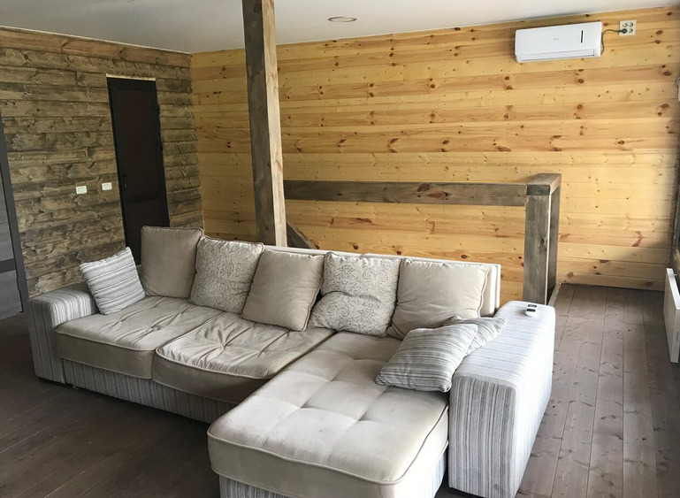 В доме оборудован банкетный зал вместимостью до 30 человек, русская баня с предбанником и уютные спальные комнаты. Рядом находится пруд и мангальная зона.