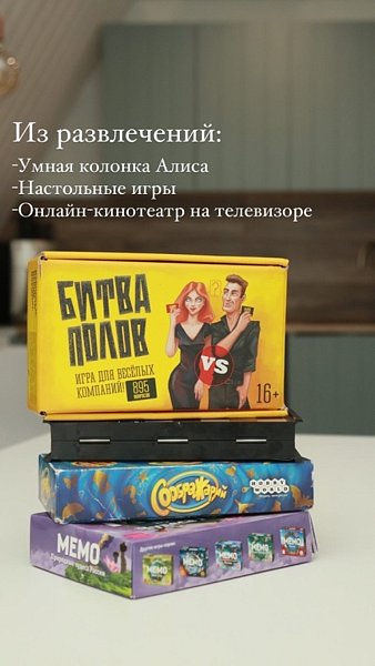 для развлечений и отдыха: телевизор, Яндекс колонка с голосовым управлением, настольные игры.