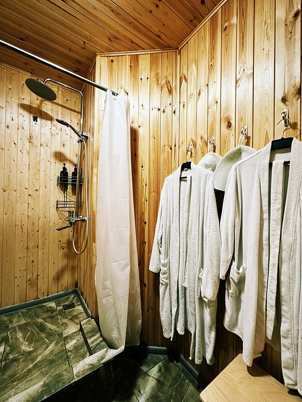 Полотенца, халаты, тапочки. Душевая и санузел в домике.