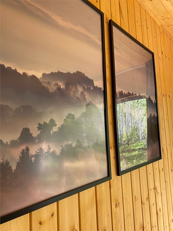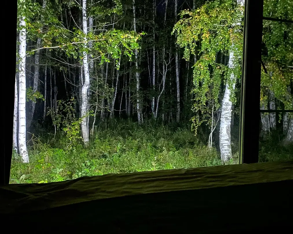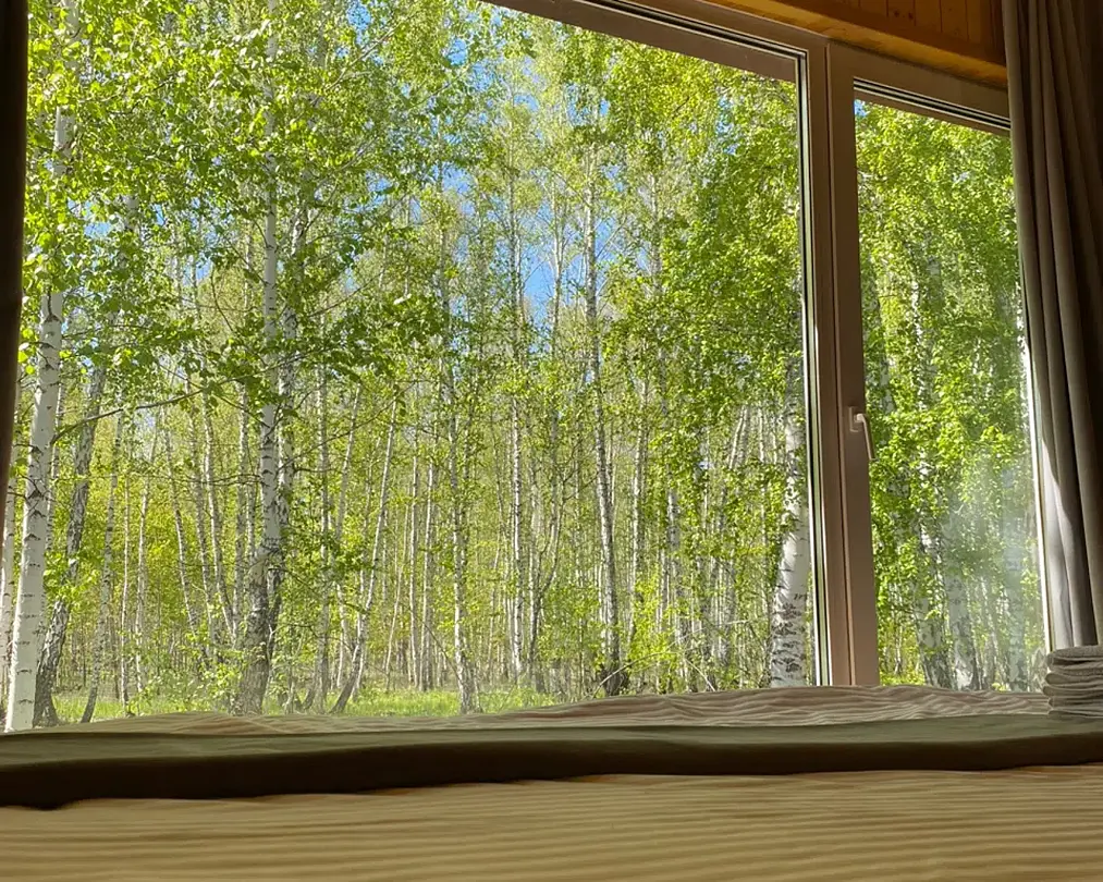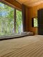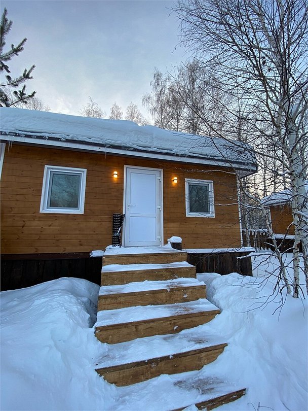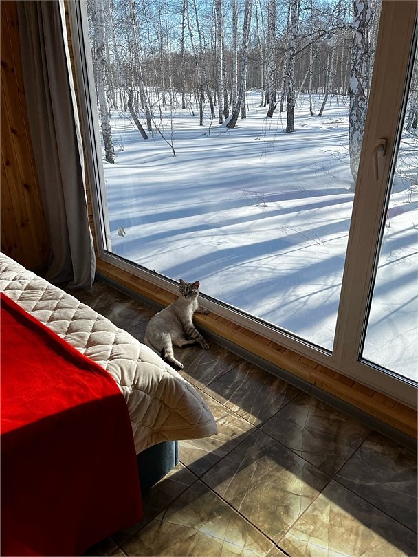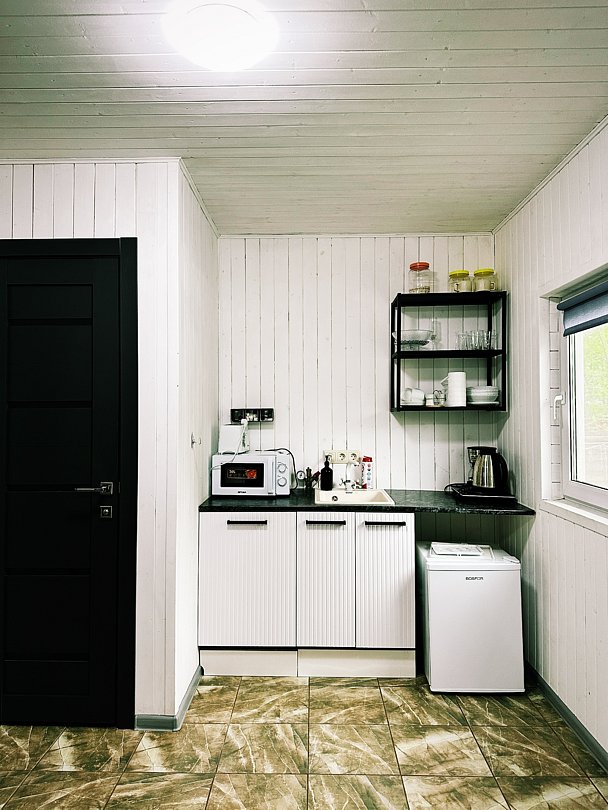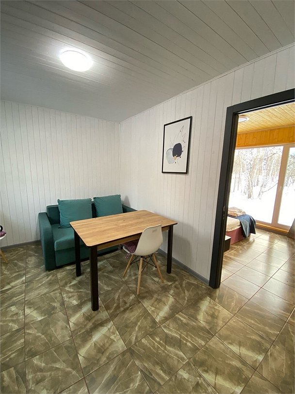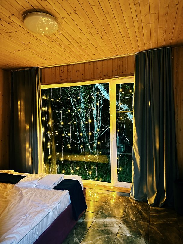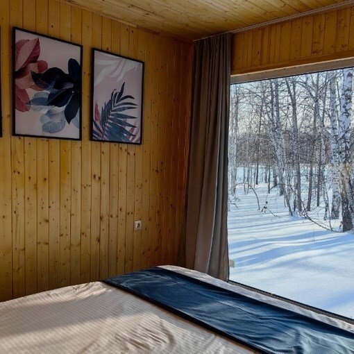 Панорамное окно в спальне. Двуспальная кровать, раздвижной диван, кухня, холодильник, свч, кофеварка, плита, чайник и санузел с душем. Домик оборудован электрическим конвектором, всегда будет тепло! Также в доме есть сауна с оборудованным душем. На территории домика имеется купель и мангальная зона.
