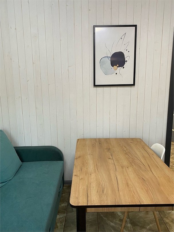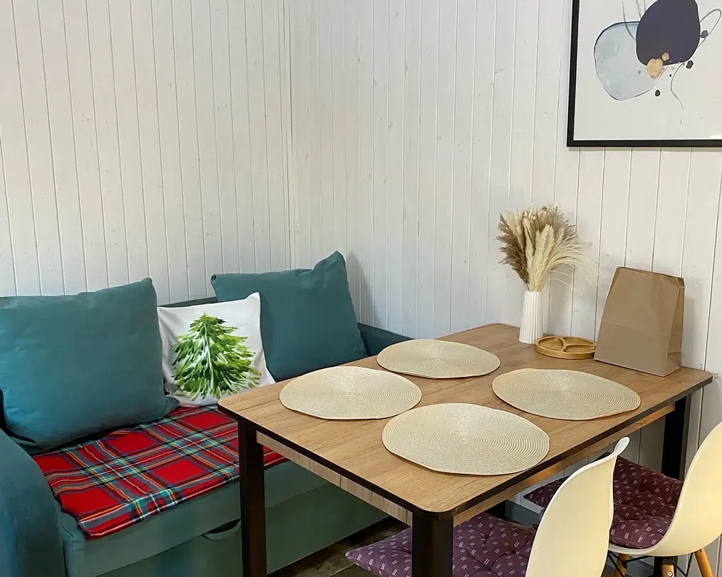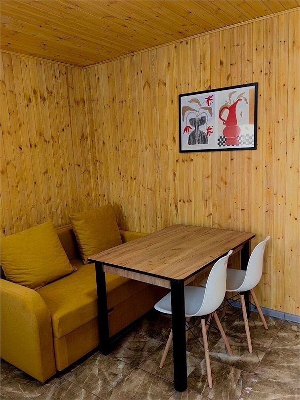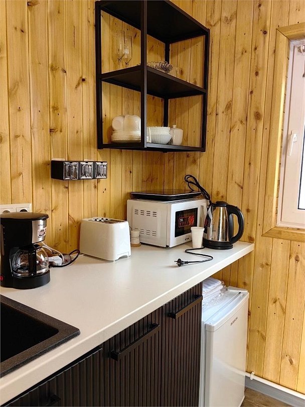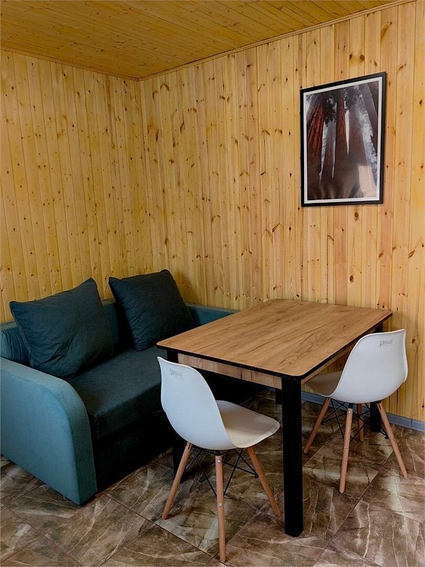 Уютный четырехместный домик Гармония с сауной для спокойного семейного отдыха. В домике есть небольшая кухонная зона со всей необходимой техникой (чайник, плита индукция, тостер, кофеварка капельная, СВЧ, холодильник), душевая, туалет - раздельные, 2сп кровать с видом на лес, раздвижной диван в столовой зоне. Во дворе - мангальная зона, купели нет, территория огорожена забором. В домике вас ждет приветственный бонус: авторский чай, орехи, мед.