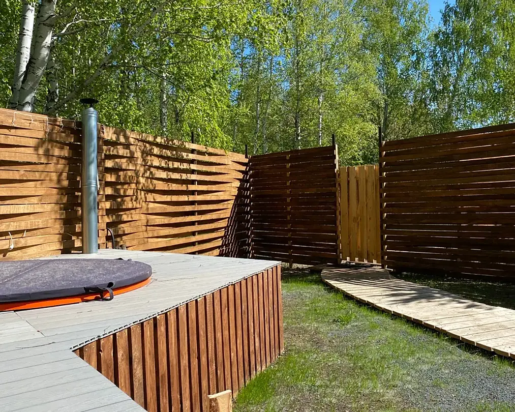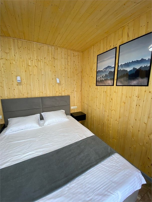 В каждом доме есть все необходимое для комфортного пребывания. Панорамное окно с подсветкой и с видом на лес добавит положительных эмоций. Каждый домик огорожен высоким забором, что означает полную приватность вашего отдыха.